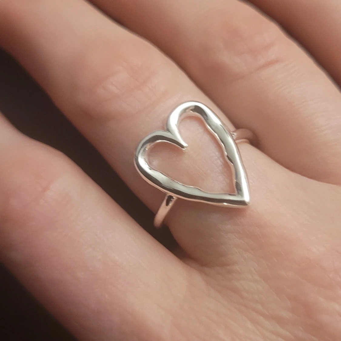 Elegant helt ny silverring 925 med en öppen hjärtdesign. Perfekt för att lägga till en subtil romantisk touch till din stil. Ringen har en slät yta och är lätt att bära varje dag.