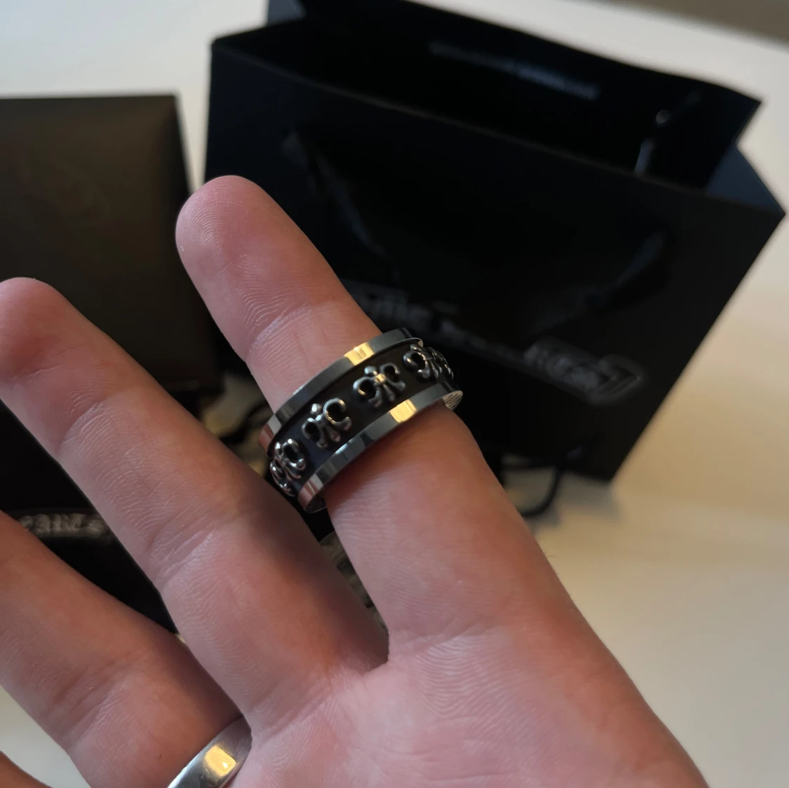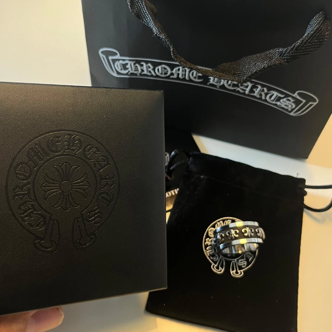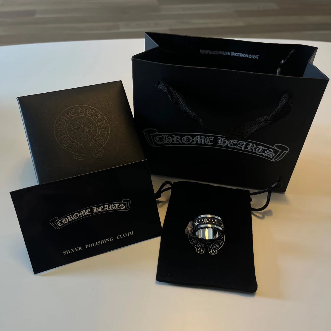 Silverring från Chrome Hearts med detaljerade korsmönster runt om. Ringen har en tydlig logotyp ingraverad på insidan. Kommer med originalpåse och ask. Pris går att diskutera och fråga bara på frågor!😊