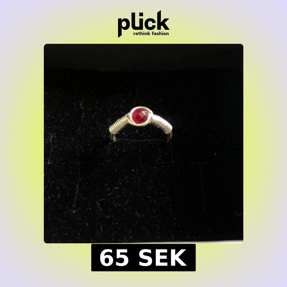 Unik silvrig ring med en rund, röd sten i mitten. Ringen är handgjord av mig, i storlek S (16 mm i diameter)