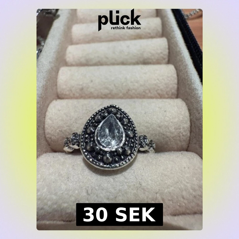 Unik silverring med en stor, droppformad klar sten i mitten och små dekorativa detaljer runt om. Ringen har en vintage vibe med pärlformade inslag på sidorna och runt stenen. Perfekt för dig som gillar statement-smycken med lite extra bling.