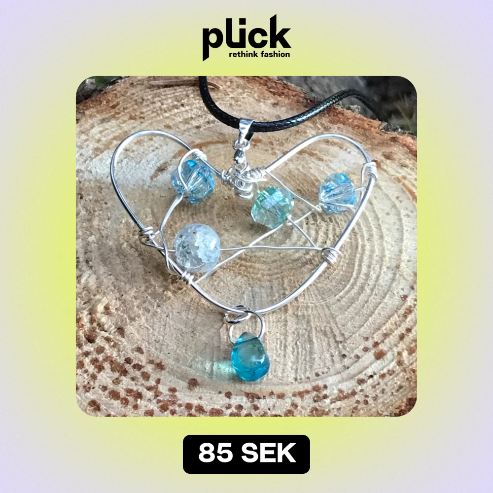 Vackert hjärt-halsband av blå glaspärlor och silveromfattning.