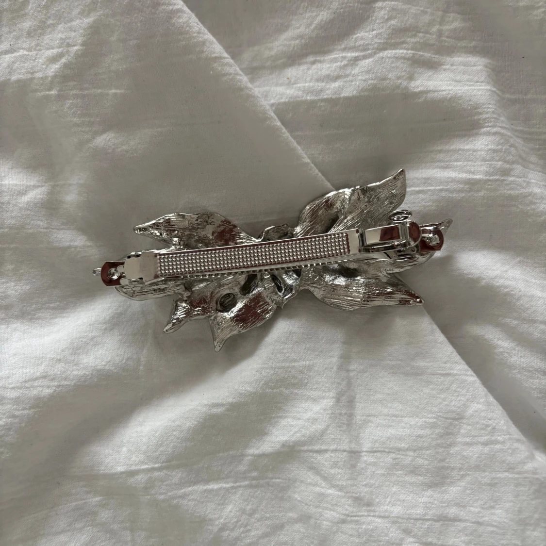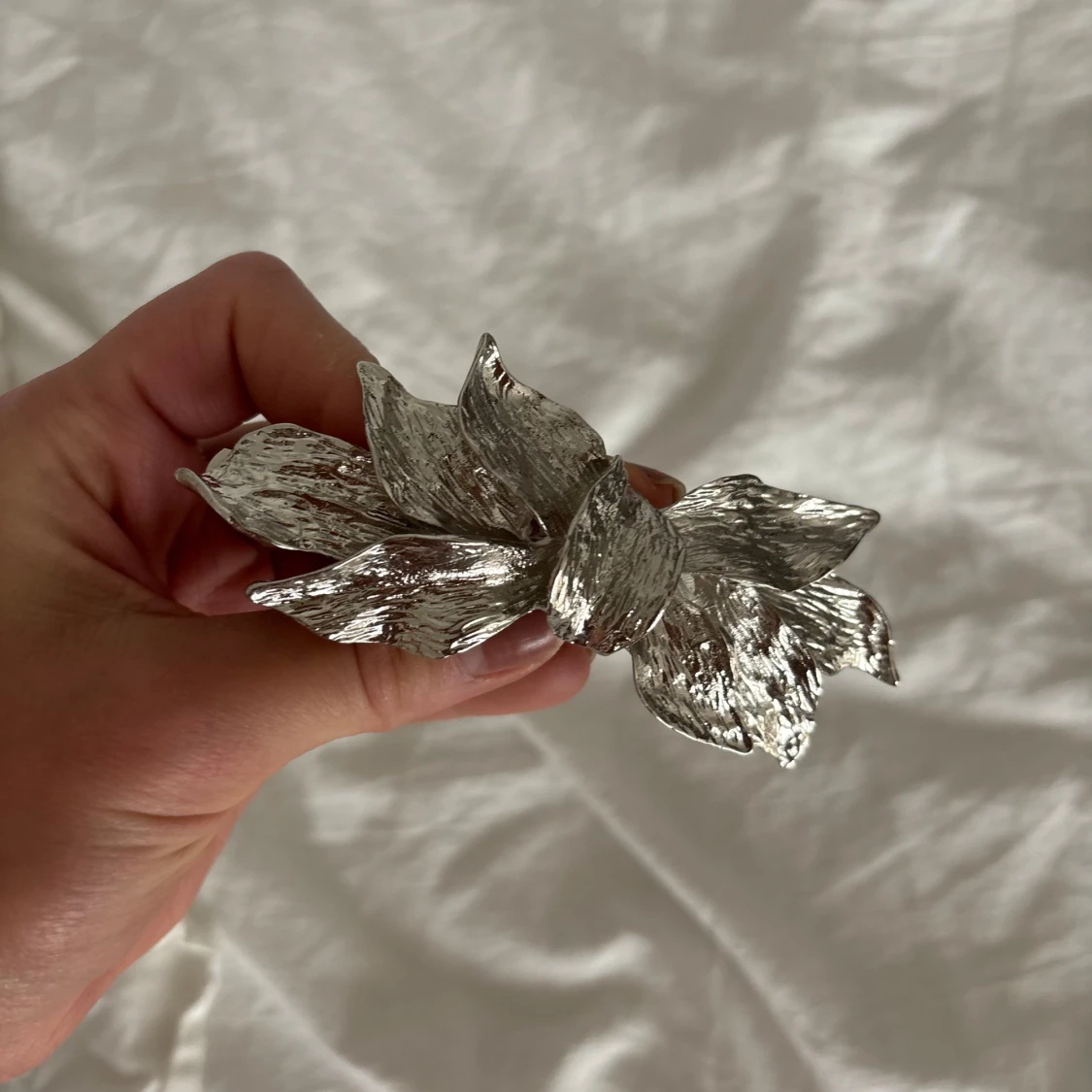 Snygg hårklämma i silverfärgad metall med en cool rosettform och texturerad yta som ger extra glans. Perfekt för att ge din frisyr en unik touch och passar till alla hårtyper. Klämman är rejäl och håller håret på plats hela dagen.
