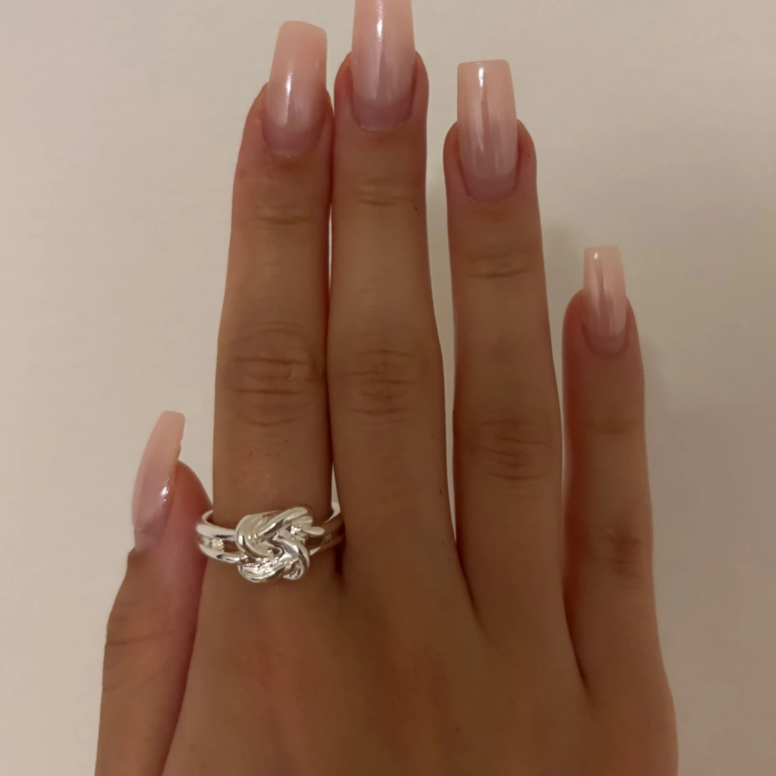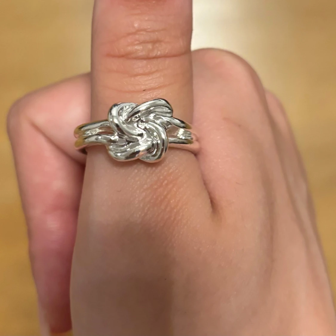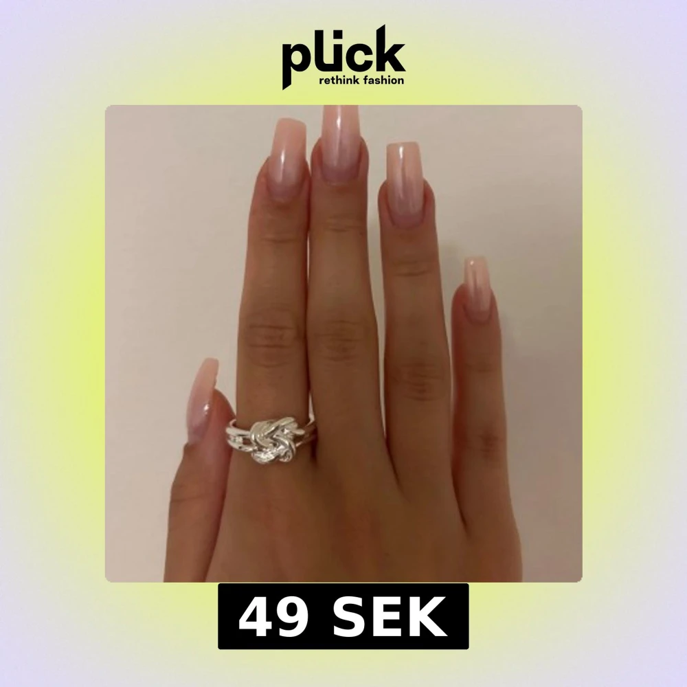Säljer en snygg silvrig ring med en unik knutdesign framtill. Ringen har dubbla band som möts i en flätad, snurrad knut som ger en cool och modern vibe. Perfekt för dig som gillar statement-smycken och vill sticka ut lite extra.