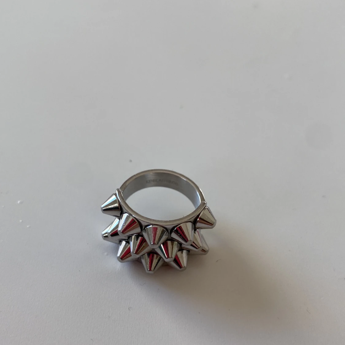 Cool och chunky ring i silverfärgad metall från Edblad, dekorerad med flera konformade nitar runt hela ringen. Perfekt för dig som gillar edgy och statement-accessoarer. Ringen har en bred form och ger en riktigt tuff vibe.
