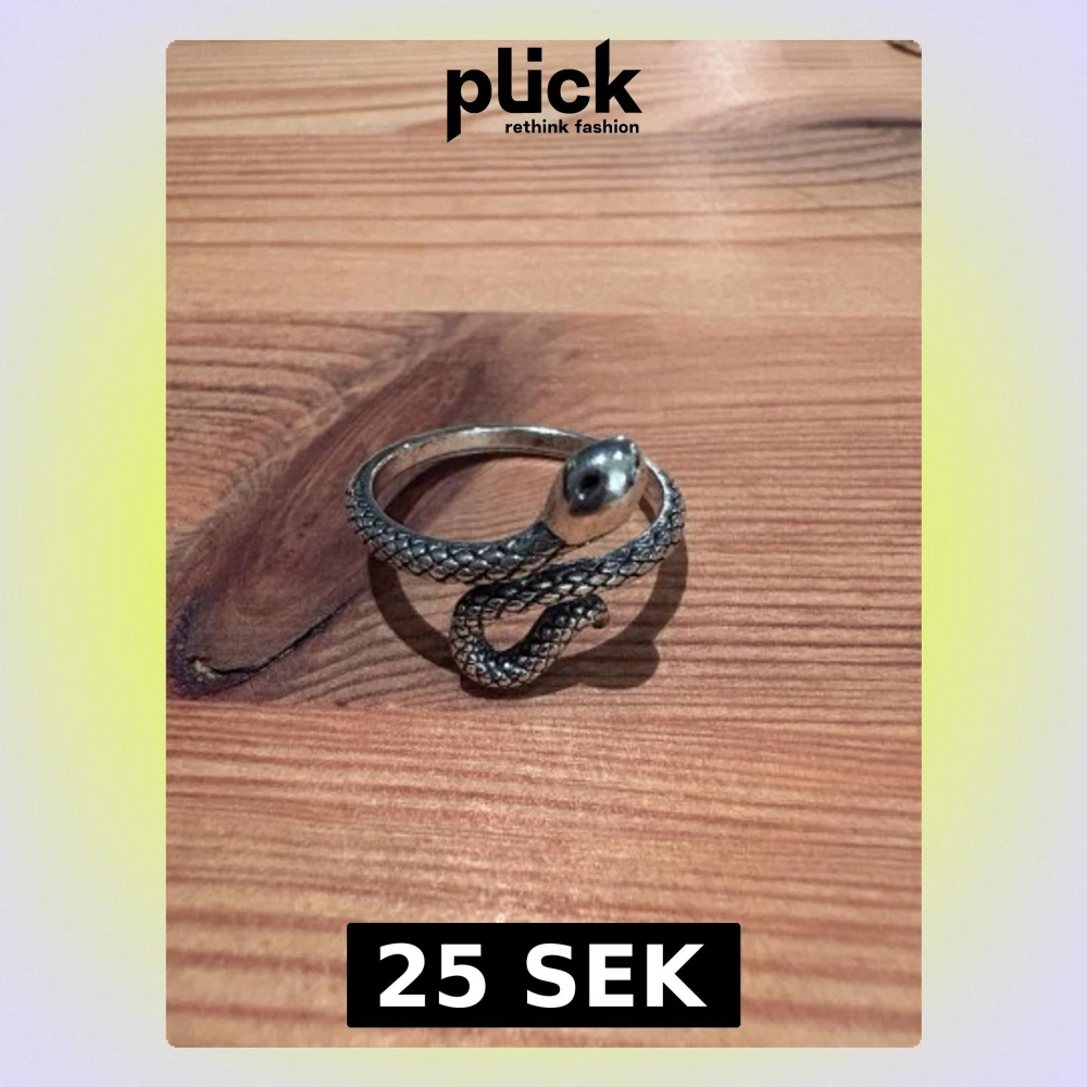 Säljer en cool silvrig ring formad som en slingrande orm. Ringen har detaljerade fjäll och ett blankt ormhuvud som ger den en edgy vibe. Perfekt accessoar för dig som gillar unika smycken med lite attityd.