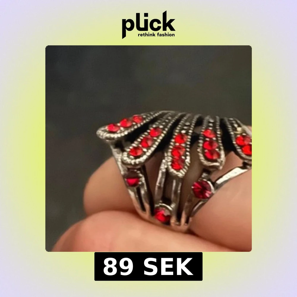 Unik silvrig ring med detaljerade röda stenar i ett mönster som liknar fjädrar eller vingar. Perfekt för att ge en edgy touch till din stil. 1 sten har hoppat av