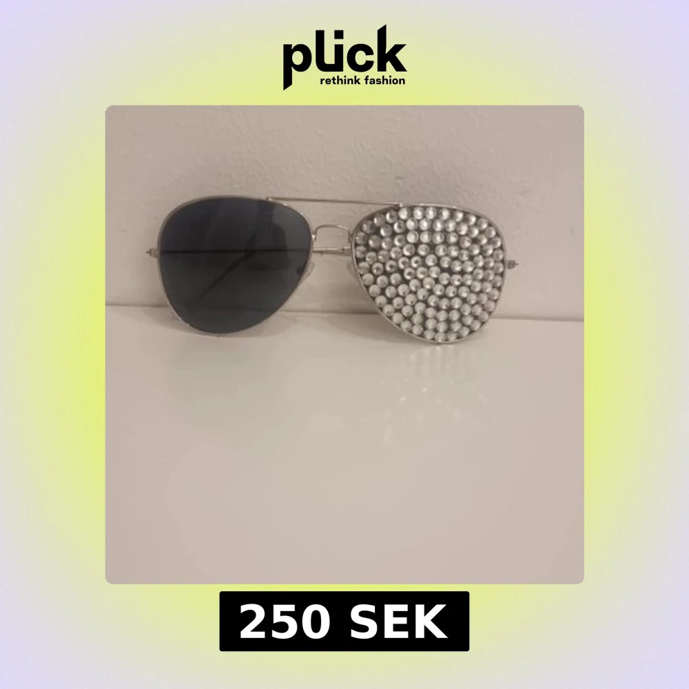 Unika aviator-solglasögon med silvrigt metallbåge. Ena linsen är täckt med glittriga pärlor medan den andra är mörkt tonad. Perfekt för dig som vill sticka ut och ha en cool accessoar till din outfit.
