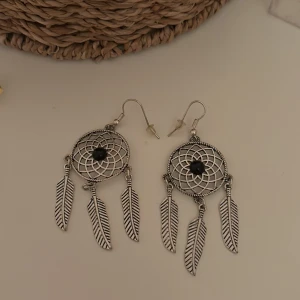 Snygga silvriga örhängen i form av drömfångare med detaljerade fjädrar och en svart pärla i mitten. Perfekta för att ge en bohemisk touch till din stil.