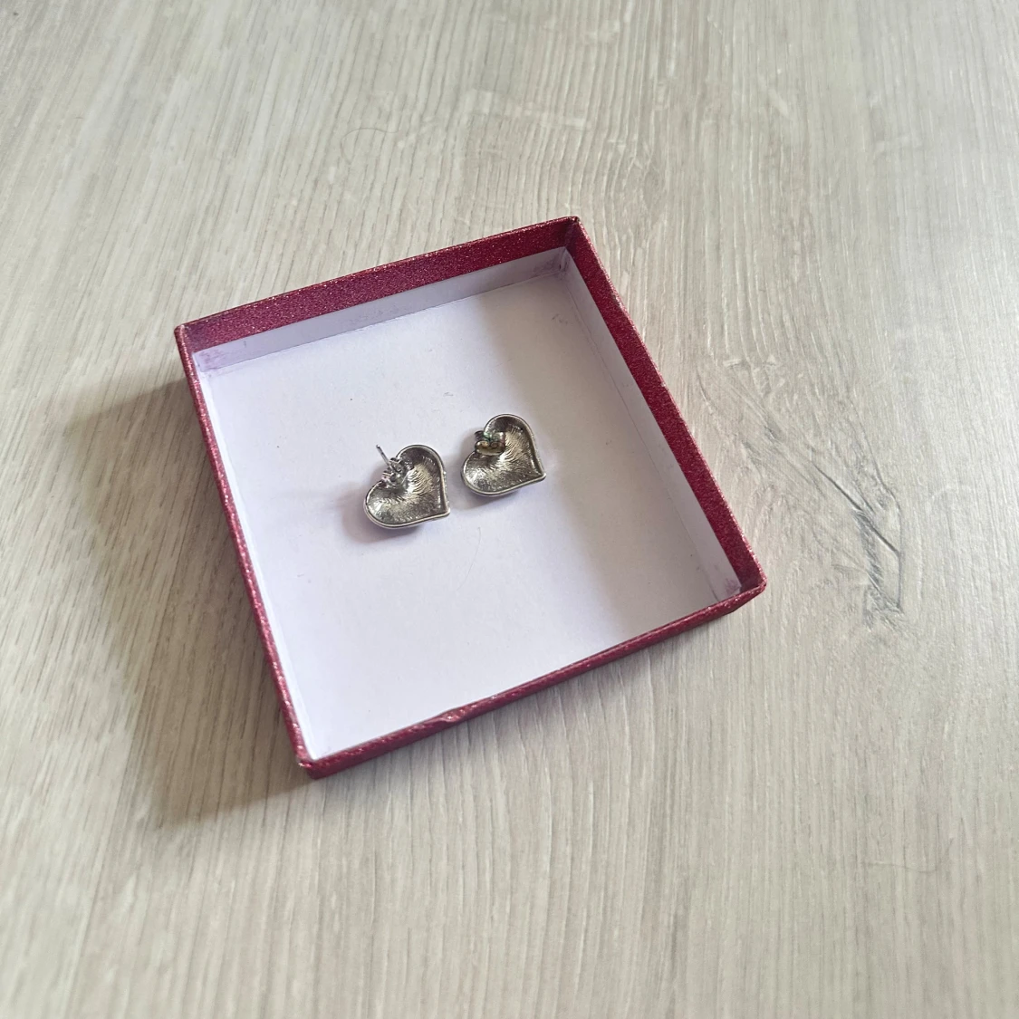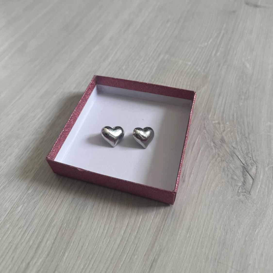 Ett par söta örhängen i form av hjärtan i silverfärg De är små och stilrena, perfekta för att ge en gullig touch till din look. Örhängena är aldrig använda och i topp skick