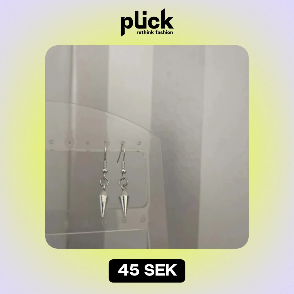 Säljer ett par coola silvriga örhängen med en konformad design. De är perfekta för att ge en edgy touch till din outfit. Passar både till vardags och fest!