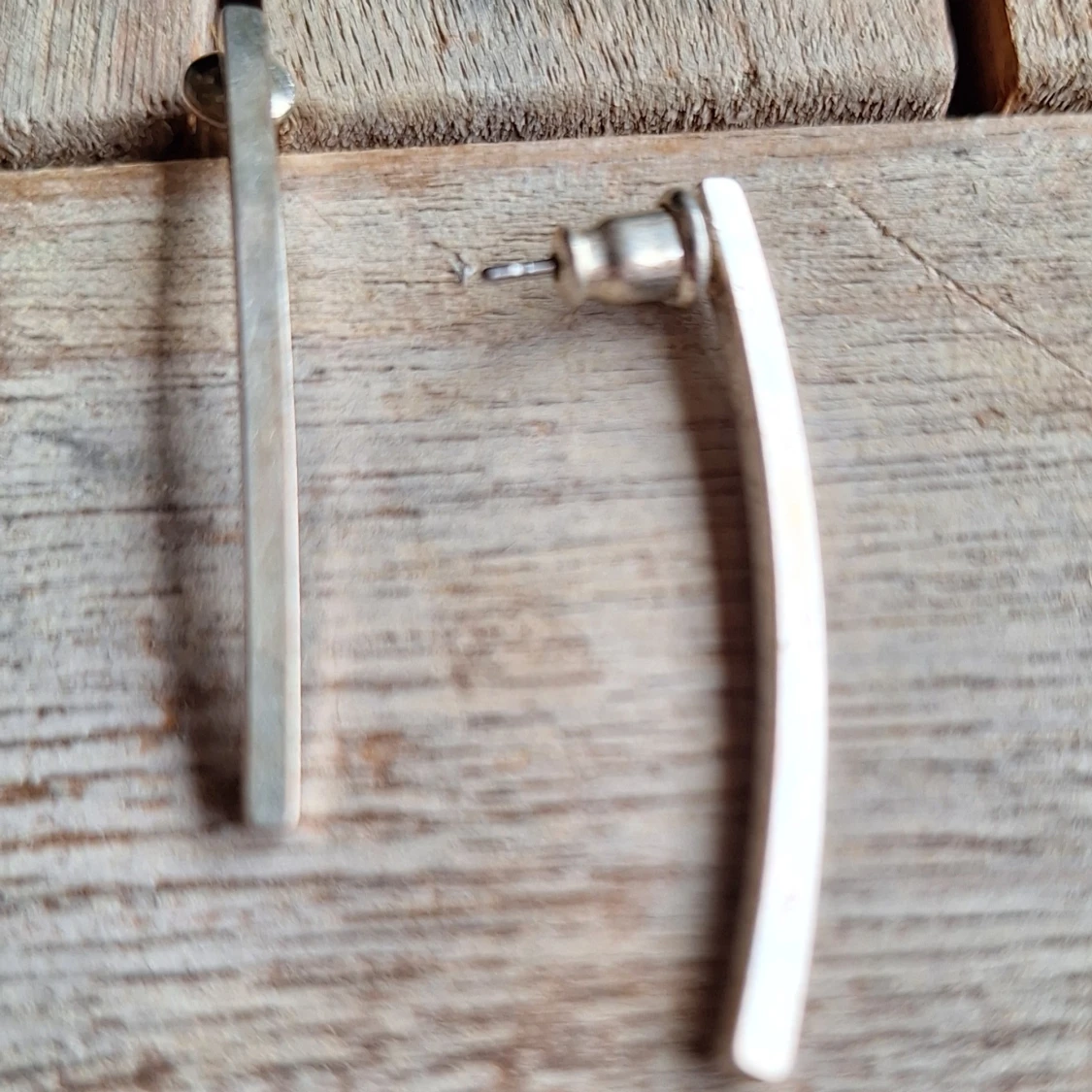 Säljer ett par stilrena örhängen i silverfärgad metall med rak och lätt böjd form. De är cirka 4 cm långa och har en enkel, modern design som passar dig som gillar minimalistiska smycken. Perfekta för att ge din look en clean touch.
