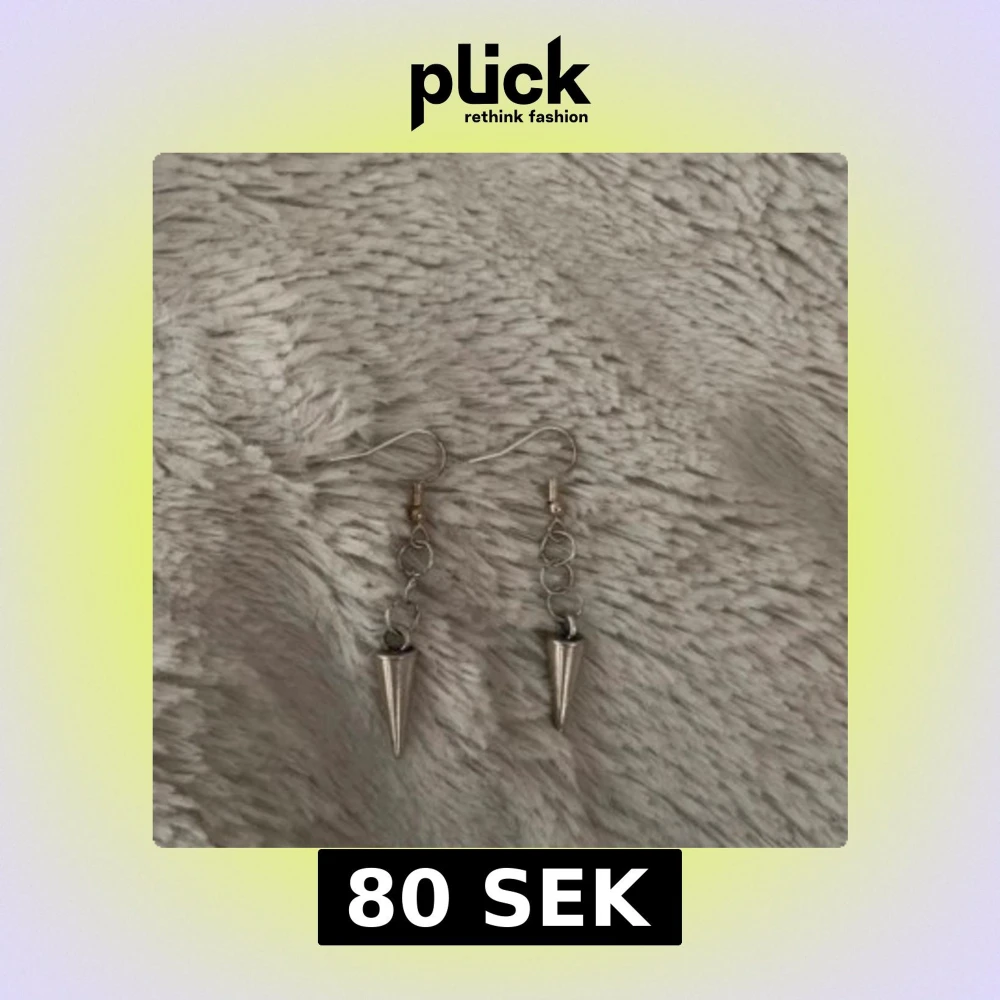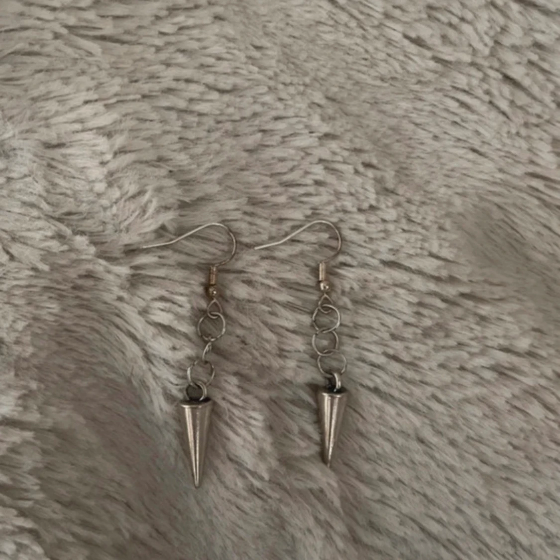 Säljer ett par coola silvriga örhängen med hängande konformade detaljer. Örhängena har flera små ringar som kedja och spetsiga hängen längst ner. Perfekta för dig som gillar en edgy stil.