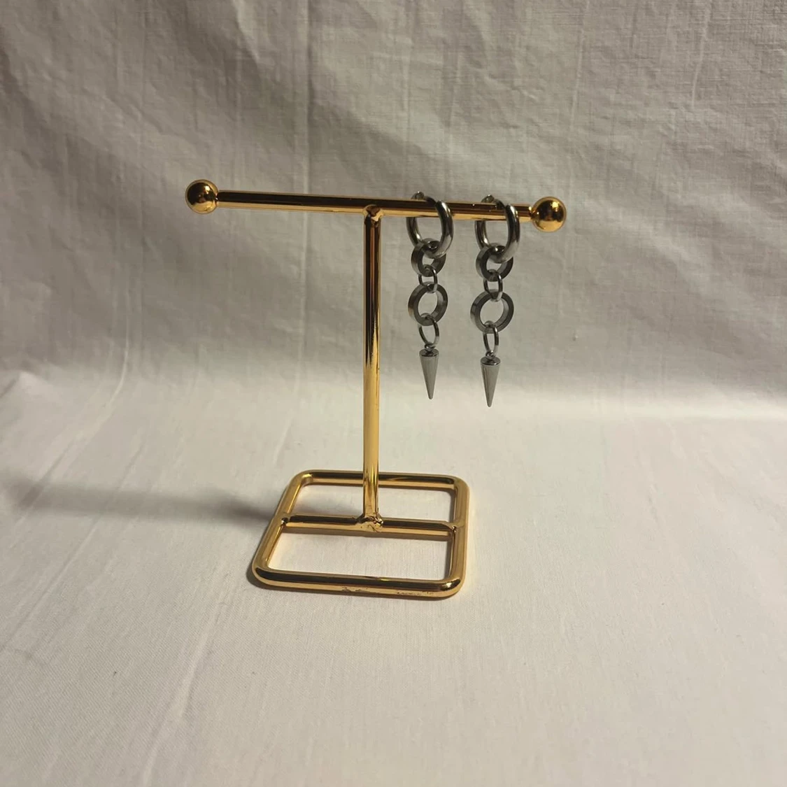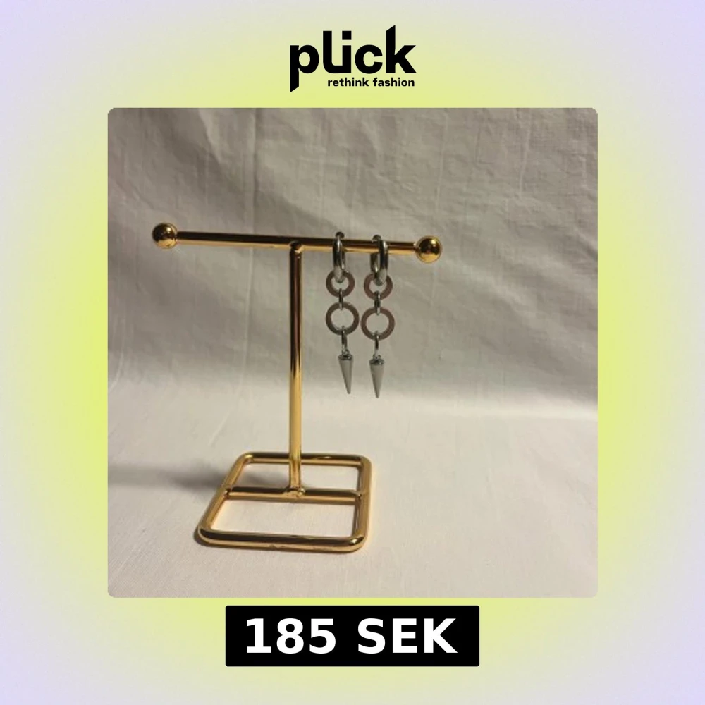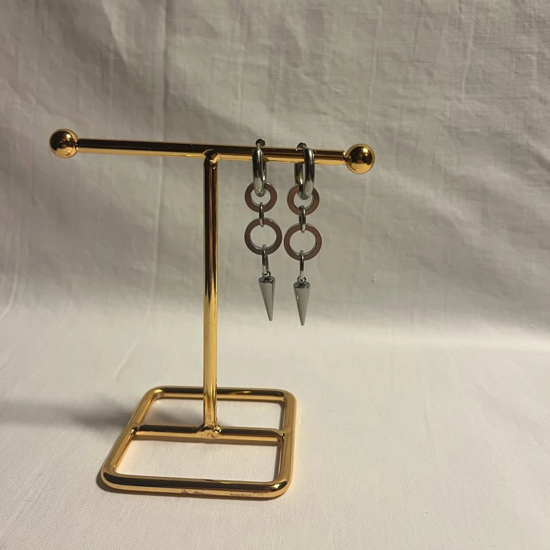 Coola silvriga örhängen med dubbla ringar och hängande konformade spikes. De har en edgy vibe och passar perfekt för dig som gillar statement-smycken. Metallisk finish och modern design gör dem till ett riktigt blickfång.