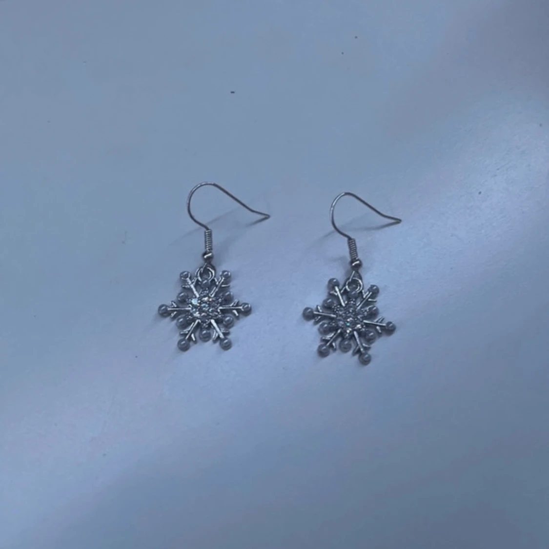 Säljer ett par superfina silvriga örhängen formade som snöflingor. Perfekta för vintern och julens alla fester! De är i mycket bra skick och har en glittrig yta som fångar ljuset fint. Passar perfekt till både vardag och festliga tillfällen. ❄️✨