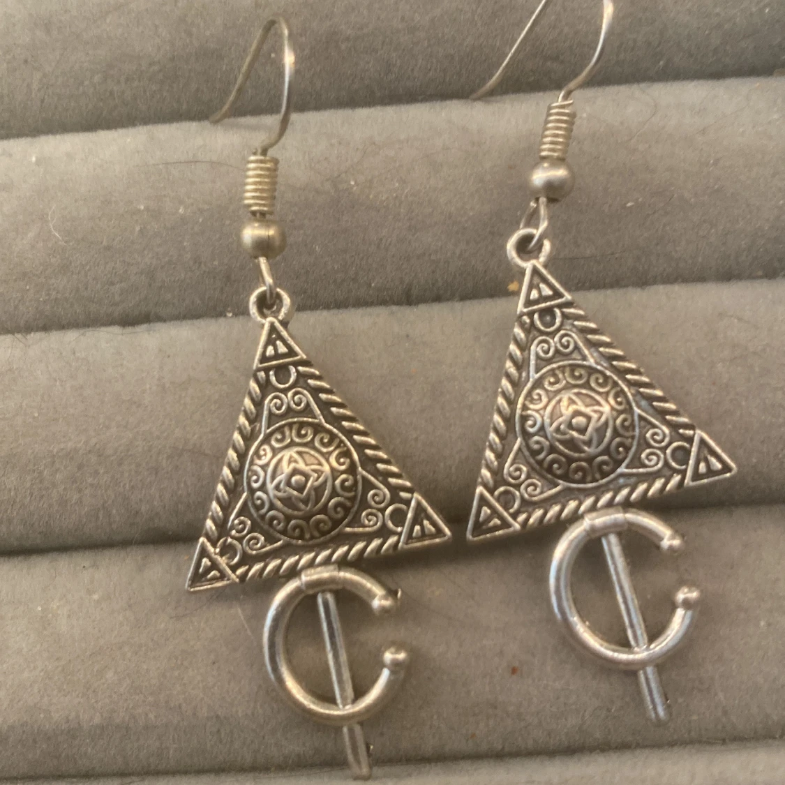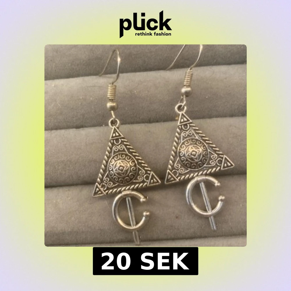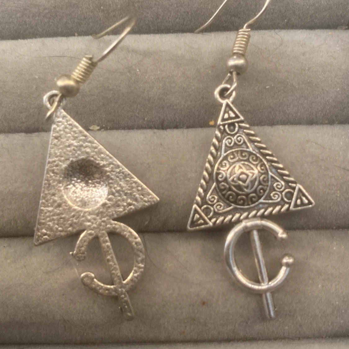 Unika örhängen i silverfärgad metall med triangelform och detaljerade mönster. Framsidan har ett cirkulärt ornament med snirkliga linjer och en stjärnliknande design i mitten. Nedanför hänger en rundad symbol som ger en cool, bohemisk vibe.