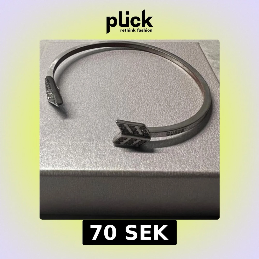 Snyggt silvrigt armband från Guess med öppet avslut och pilformade ändar. Båda ändarna är dekorerade med glittriga stenar som ger extra bling. Armbandet har en stilren och modern design, perfekt för dig som gillar att sticka ut med accessoarer. Har tappat lite i färg på insidan.