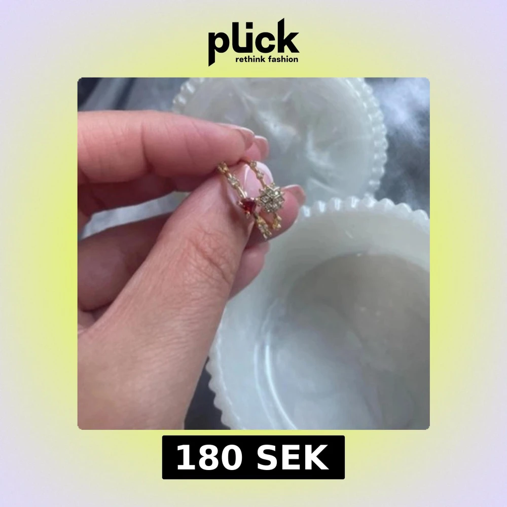 Säljer två tunna guldiga ringar, en med en röd hjärtformad sten och små klara stenar, och en med en stjärnformad detalj med gnistrande stenar. Köpta i tyurkiet! Perfekta att bära tillsammans eller var för sig för en söt och trendig look. Storlek 7 som är storlek 15
