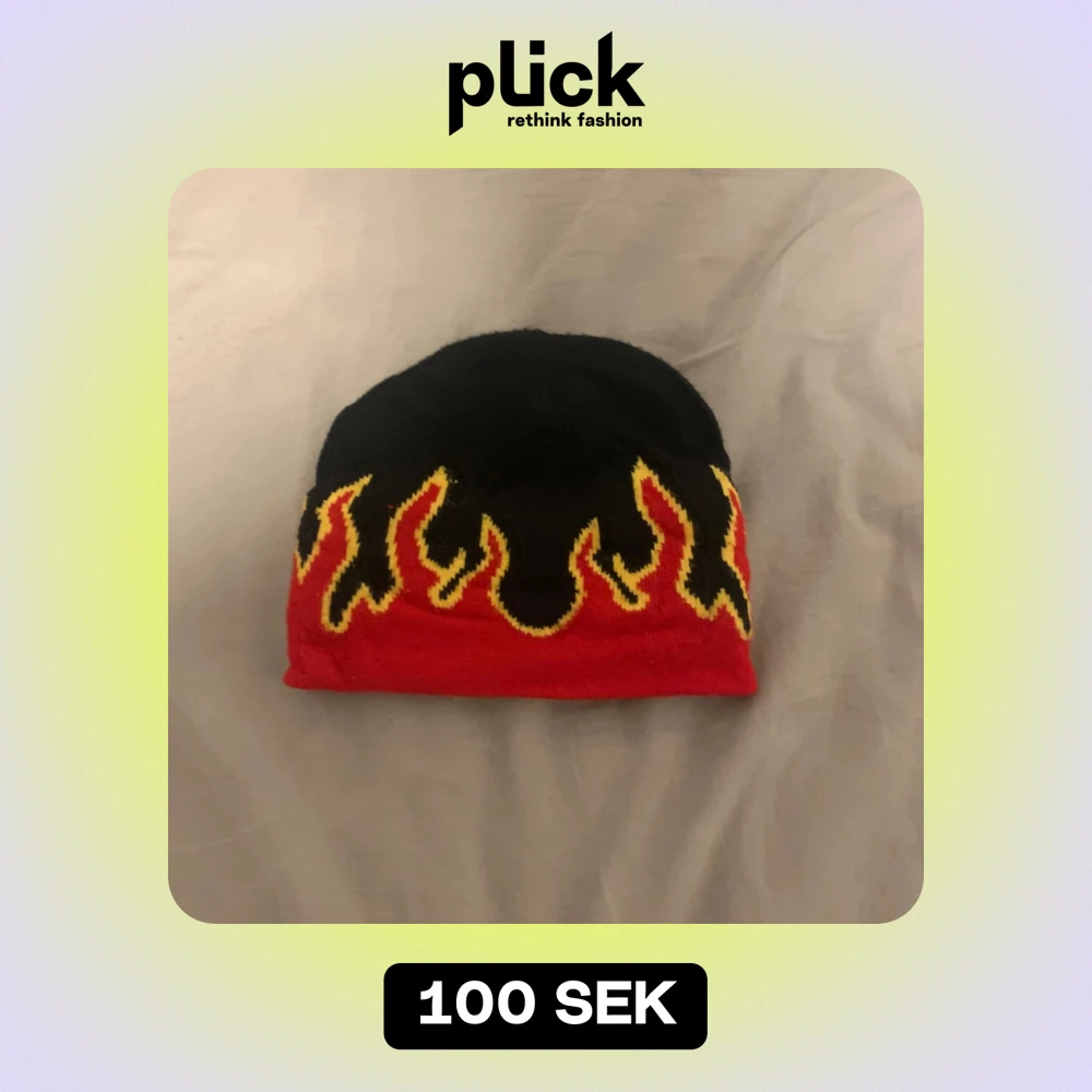 Cool mössa med ett eldsflammönster i rött och gult mot en svart bakgrund. Perfekt för att sticka ut i mängden och hålla huvudet varmt under kyliga dagar. Passar både till vardags och för att ge lite extra stil på festen.