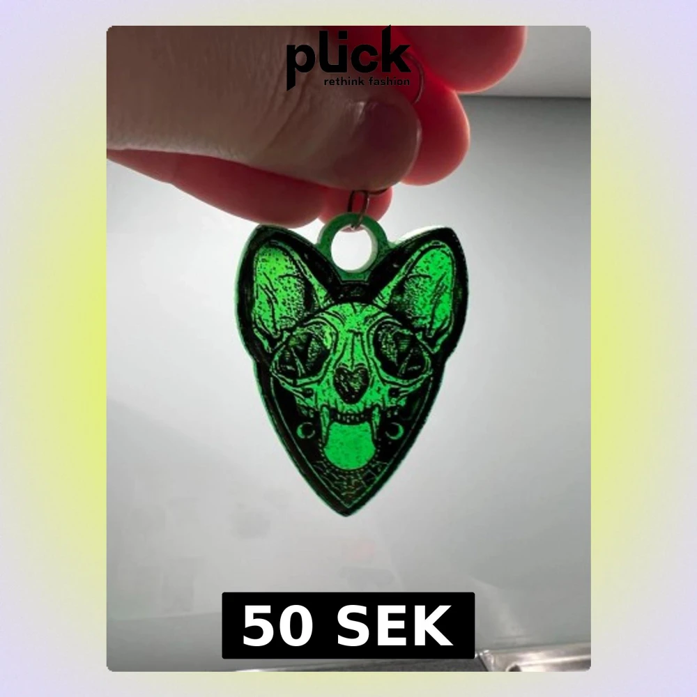 Unika örhängen i färgen grönt med glitter och ett coolt djurkranium motiv i svart. Formen är hjärtliknande med spetsig nedre kant och örhängena har metallkrokar. Perfekt för dig som gillar statement-smycken och djurmotiv.