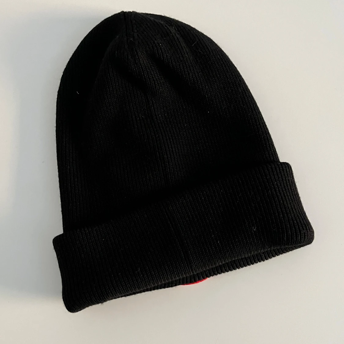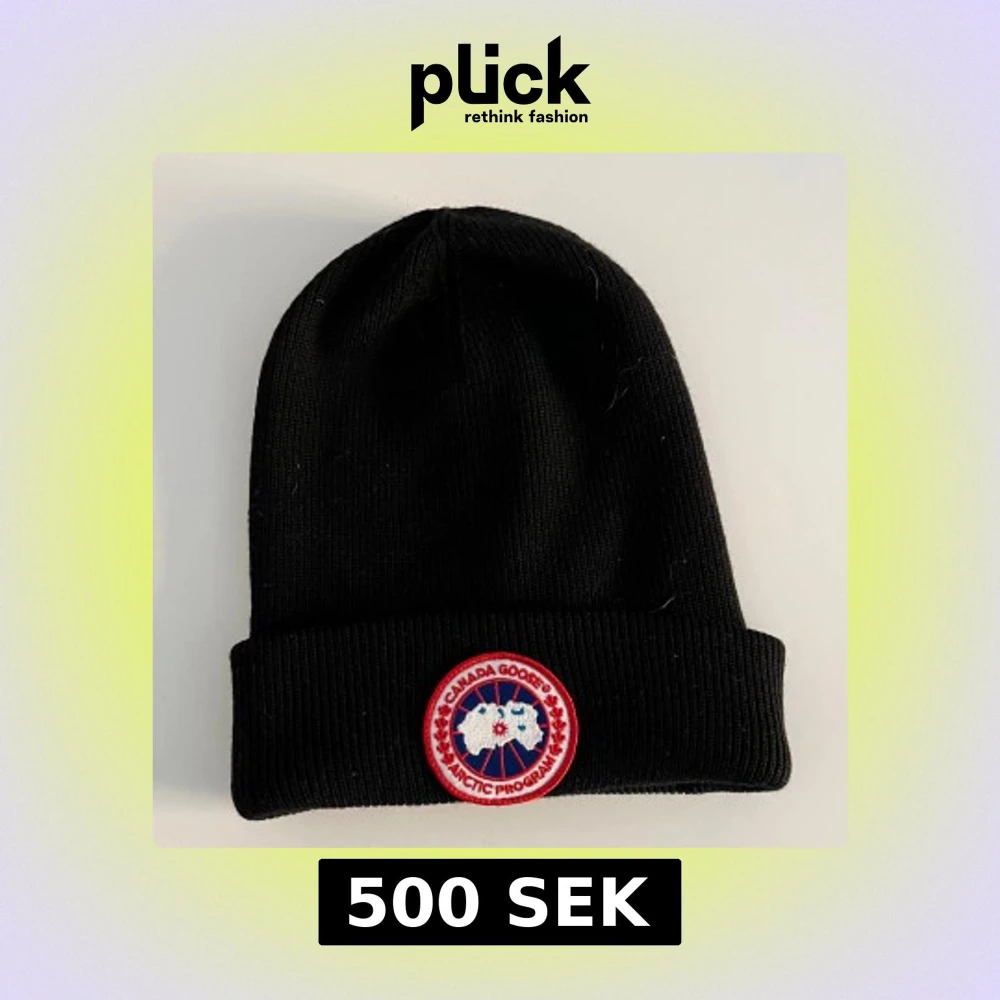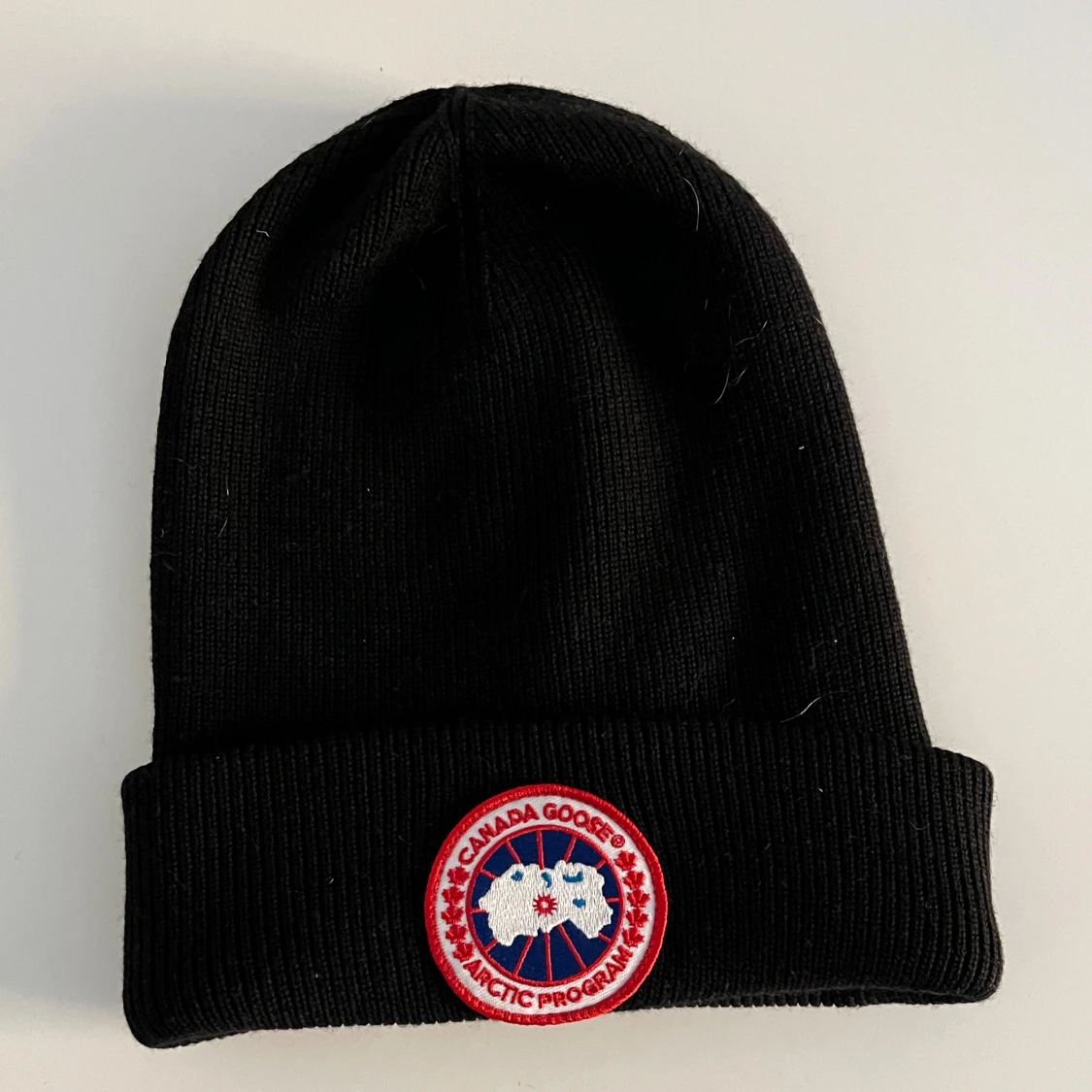 Svart ribbstickad mössa från Canada Goose med klassisk uppvikt kant och det ikoniska runda Arctic Program-märket framtill i rött, vitt och blått. Inköpt på Johnells - kvitto finns på mail vid förfrågan.