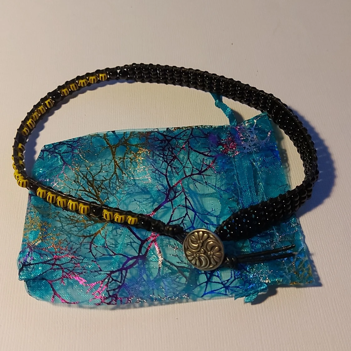 Armbandet är gjort av skinnrem och pärlor med metallknapp. Lätt att ta på. Bilderna får tala för sig själva. En fin påse medföljer. Frakten betalas av köparen. OBS Det går inte att ringa mig på mobilen bara via e-mail på: elisabethraad1950@gmail.com