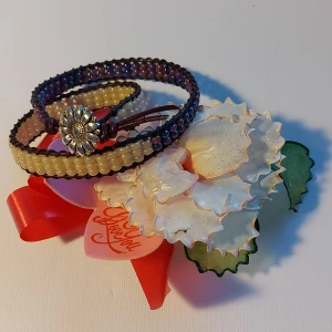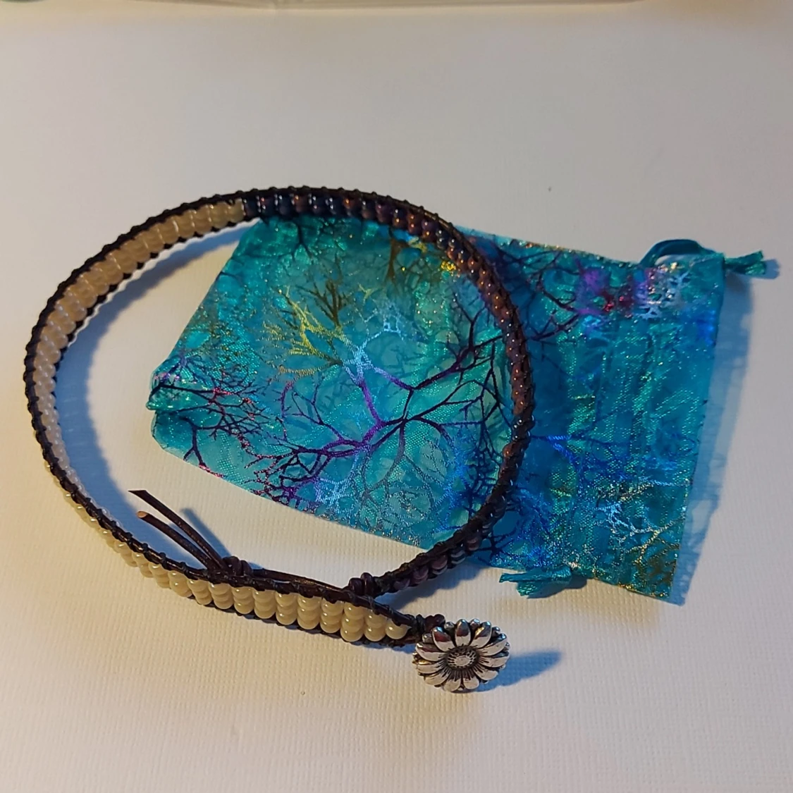 Armbandet är gjort av skinnrem och pärlor, med metallknapp. Lätt att ta på. Bilderna får tala för sig själva. En fin påse medföljer. Frakten betalas av köparen. OBS Det går inte att ringa mig på mobilen bara via e-mail på: elisabethraad1950@gmail.com