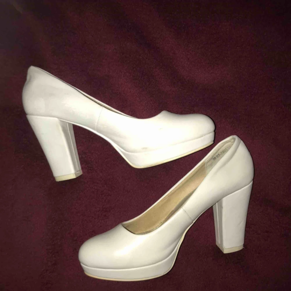 Vita klack , använd fåtal gånger, ca 8cm klack, storlek 38 men väldigt tighta runt om foten så skulle nästan säga att det är en 37a, kan ej gå i dem längre tyvärr🤍 50kr