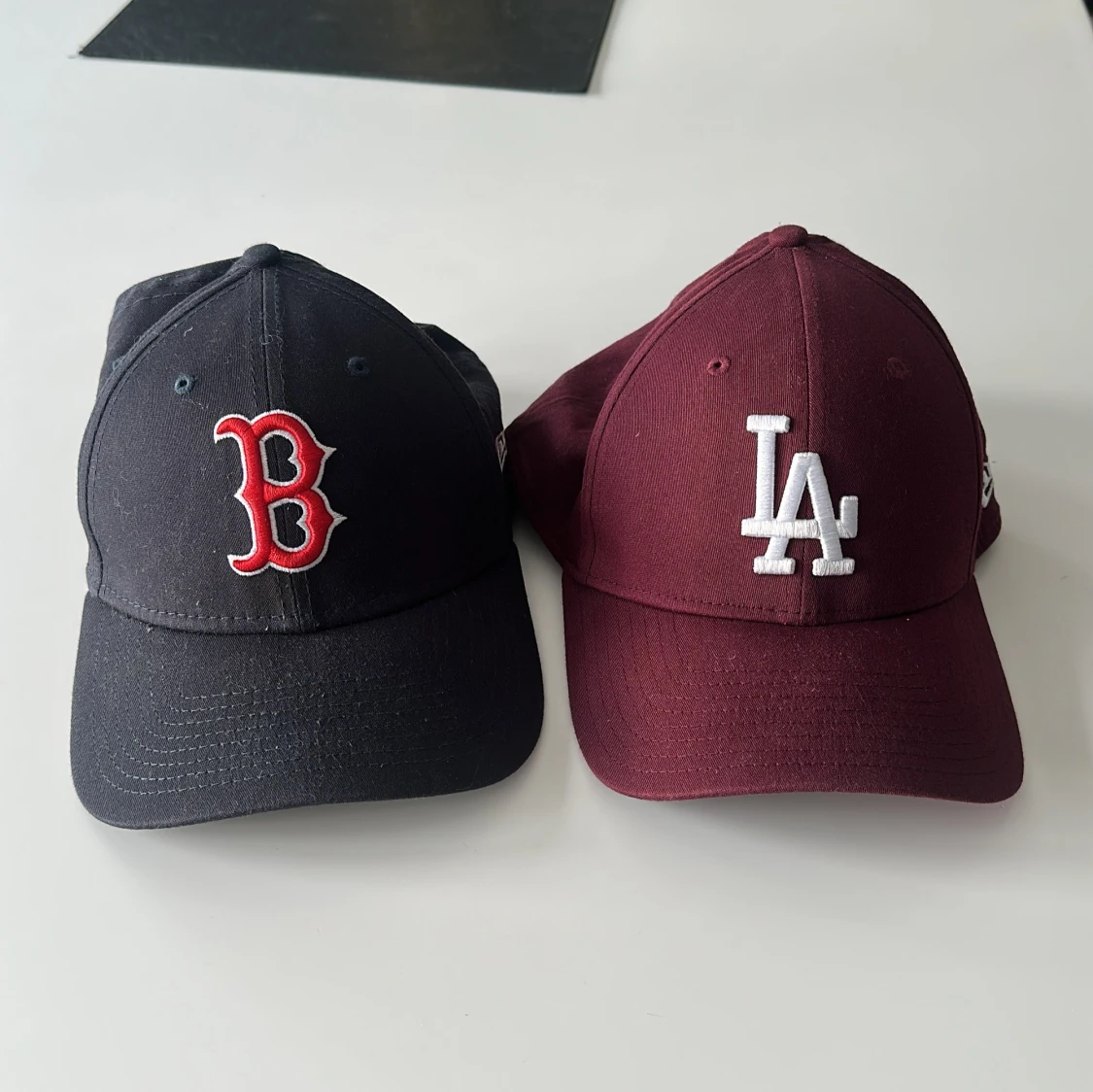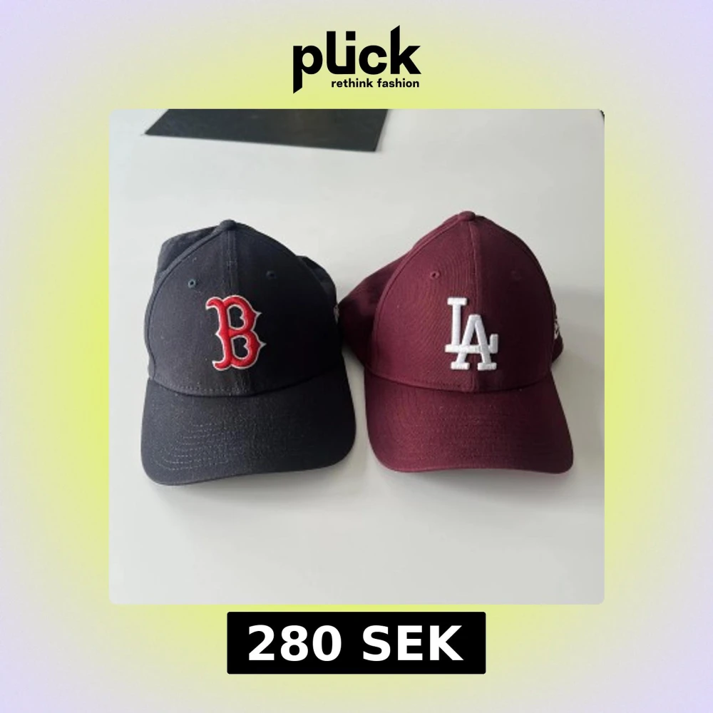 Två snygga New Era 39THIRTY kepsar, en svart med Boston Red Sox röd B-logga och en vinröd med LA Dodgers vit logga. Båda är böjda i skärmen och har broderade detaljer. Materialet är bomull med lite elastan för skön passform.