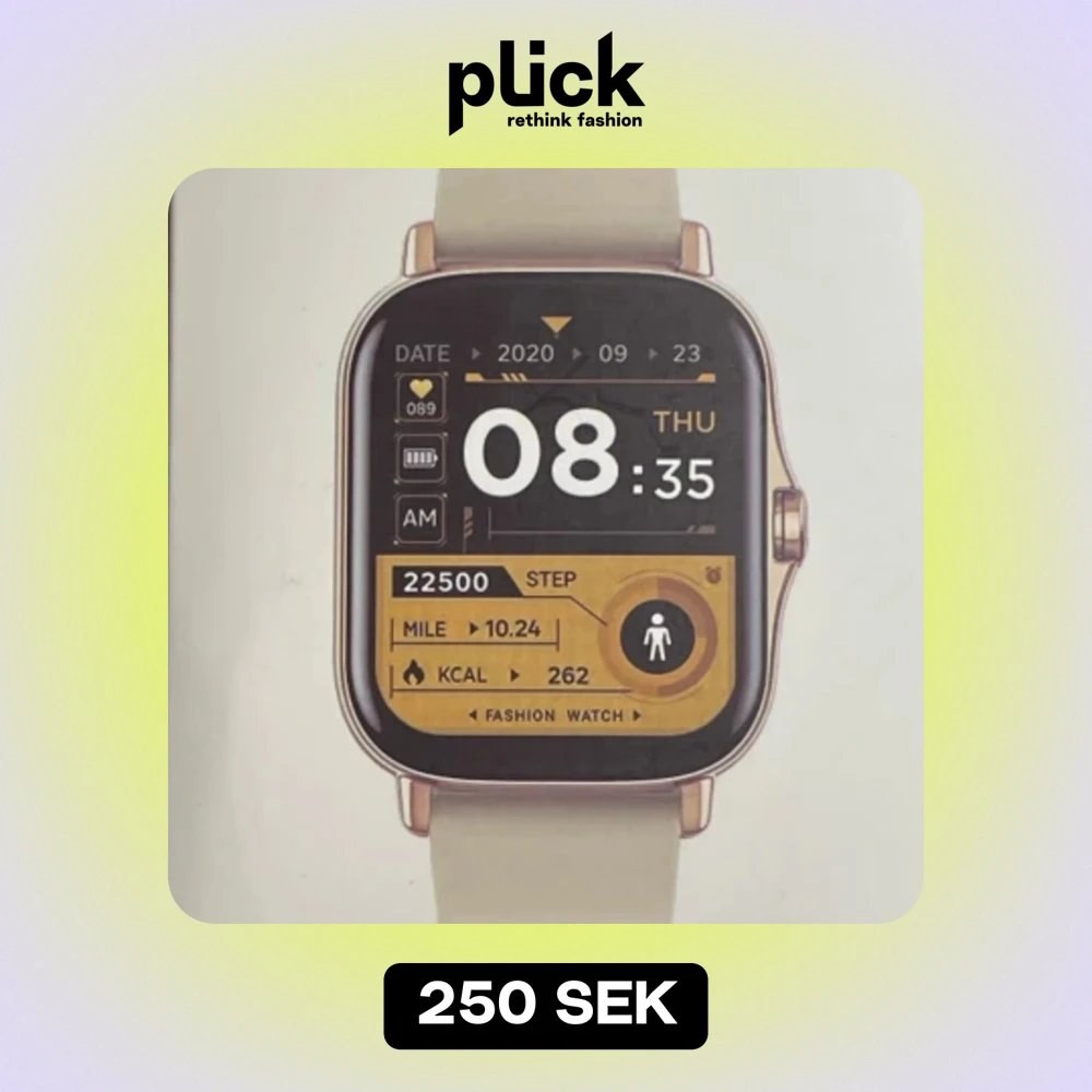 Säljer en snygg smartklocka med en fyrkantig skärm och rosa detaljer. Klockan har en modern design med flera funktioner som stegräknare och kalorimätare. Den kommer med två olika armband, ett i rosa silikon och ett i metall. Perfekt för både vardag och fest!