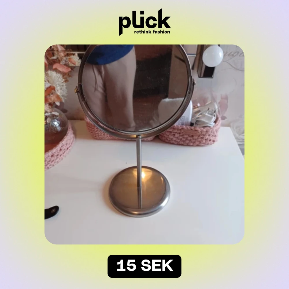 En begangnad sminkspegel i gott skick. På ena sedan är det extra "inzoomat". Spegeln är grå och varumärket är jag lite osäker på😬🙂