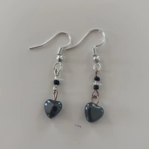 Handgjorda Örhängen med kristall hjärtan. Svarta och vita pärlor. Gjord av silver. De har tidigare varit nyckelringar som jag har gjort om till örhängen