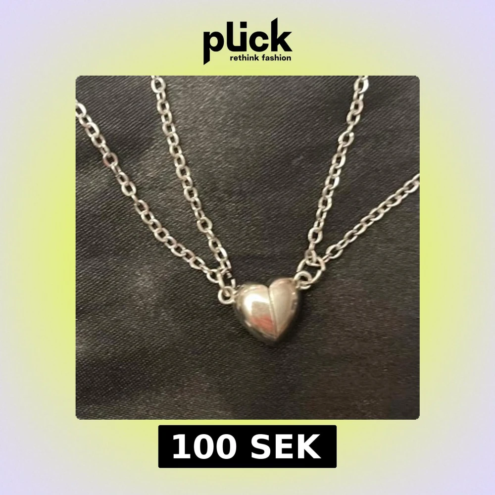 Två halsband med varsin magnetiskt hjärthalva. Halvorna klickar ihop med magnet när de förs tillsammans. Trädd på kedja i silverimitation som är justerbar 45-50 cm. Berlockerna är ca 1 x 0,5 cm. Perfekt att dela med din partner, bästa vän eller någon anan som betyder mycket!❤️