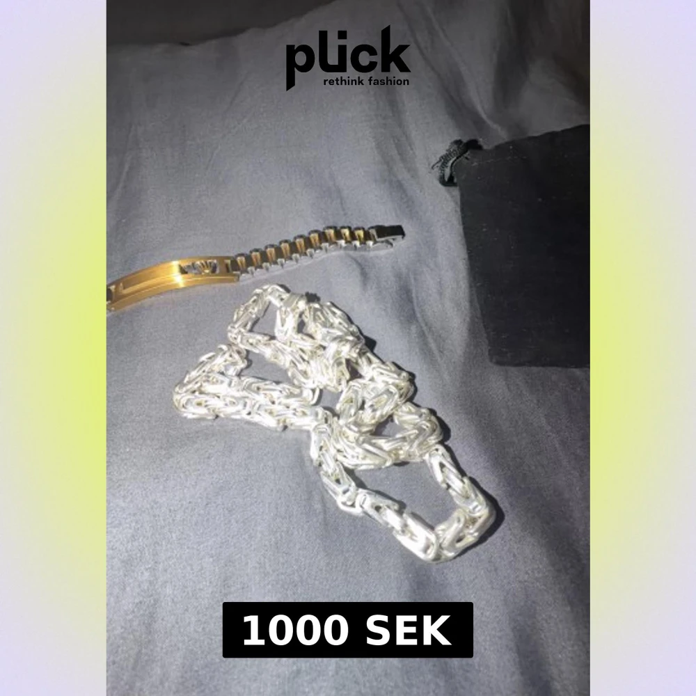Bilderna visar en guldfärgad och silverfärgad länk, samt en svart tygpåse. Ingen väst syns på bilderna, så ingen beskrivning av väst kan ges.