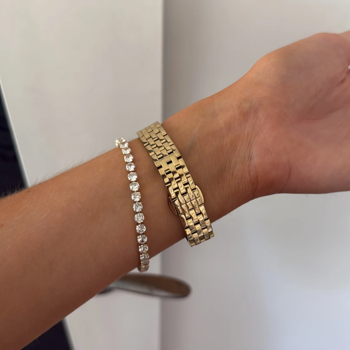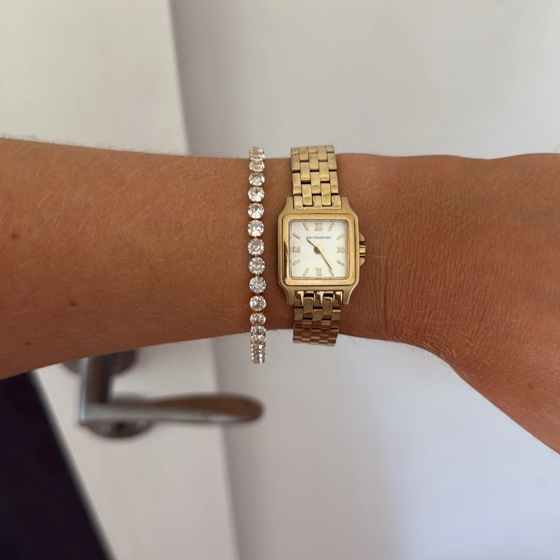 Klocka från Muli Collection Tillverkad av 316L rostfritt stål med ett repfritt safirglas Klockan har en vattentät grad på 5ATM Urverket är en högkvalitativ Japan Miyota 5R21 kvarts och urtavlans storlek är 20mm Klockarmband mäter 17,5 mm med en tjocklek på 13 mm Den är justerbar upp till 20 mm. FÖLJER MED LÄNKAR FÖR GÖRA STORLEKEN REGLERBAR.
