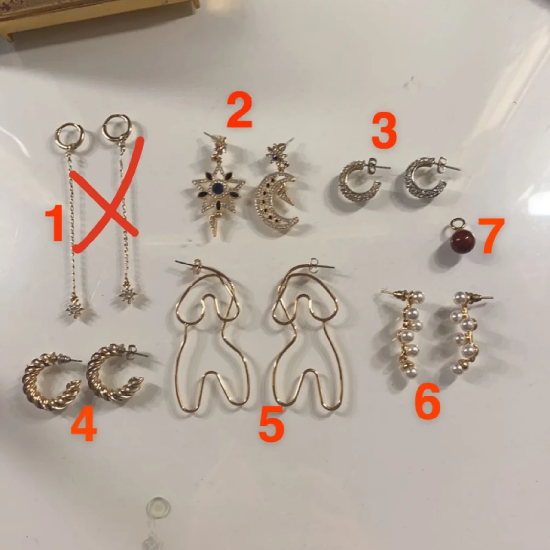 örhängen i guld med kristall/pärl detaljer (nummer 7 är ett hänge till halsband, kristallen är en röd jaspis) 1: 40kr 2: 50kr 3: 40kr 4: 40kr 5: 50kr 6: 30kr 7: 50kr