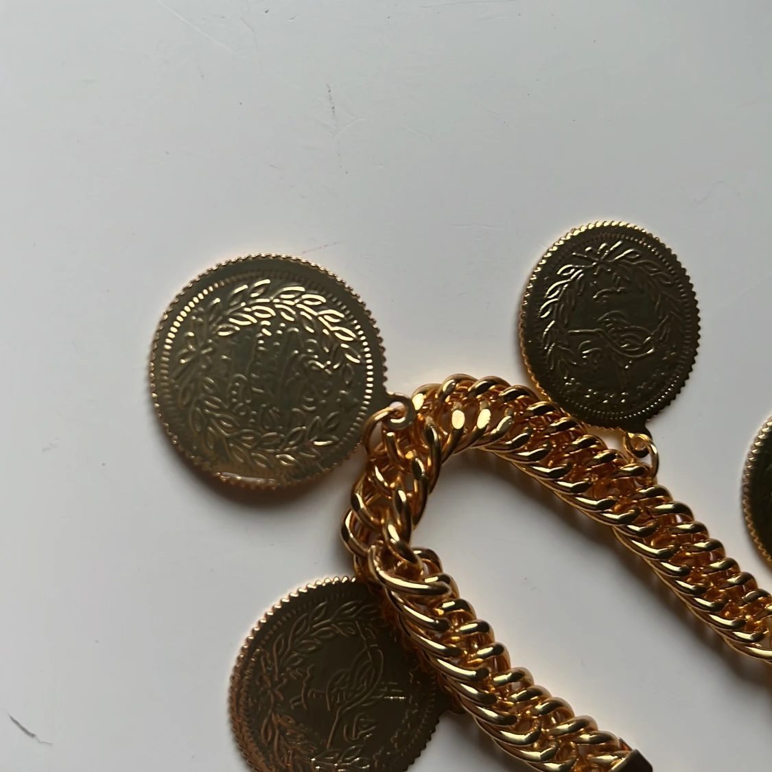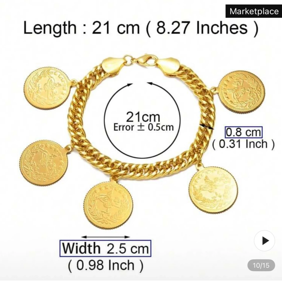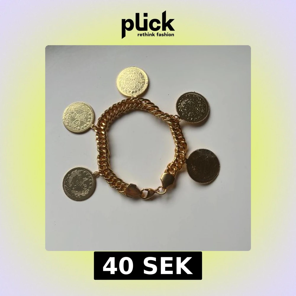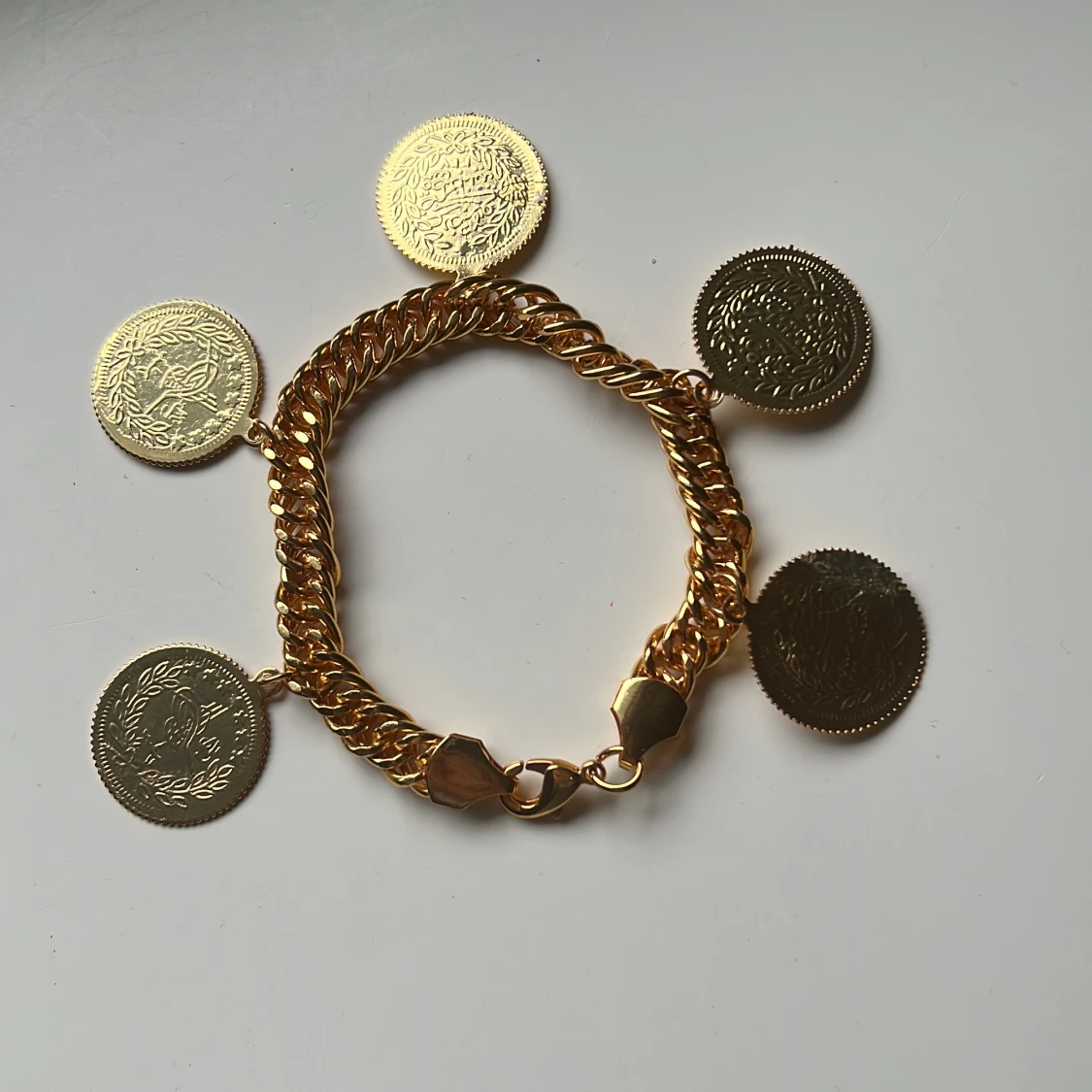 Snyggt armband i guld-look med fem stora myntberlocker. Kedjan är 21 cm lång och 2,5 cm bred. Perfekt accessoar för att ge din outfit en unik touch. Aldrig använd.