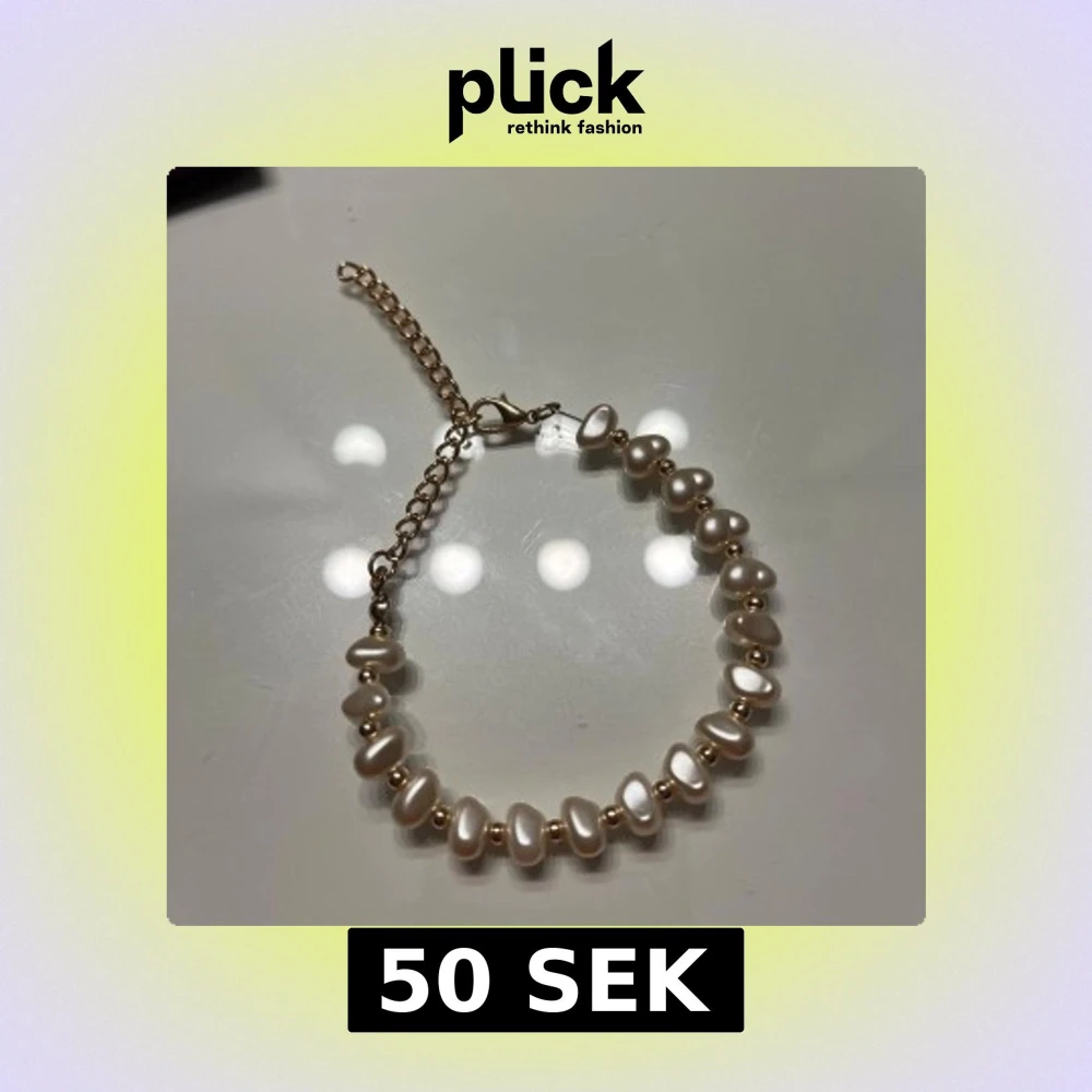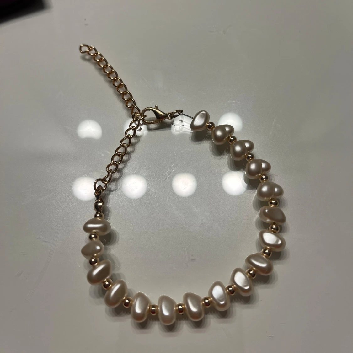 Elegant armband med vita pärlor och en justerbar kedja. Aldrig använt.