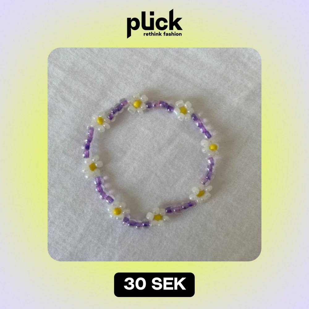 Säljer detta handgjorda pärlarmbandet gjort av en elastisk och slitstark tråd. Perfekt till våren! 💜💛🤍