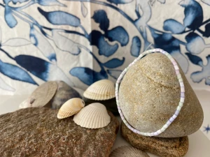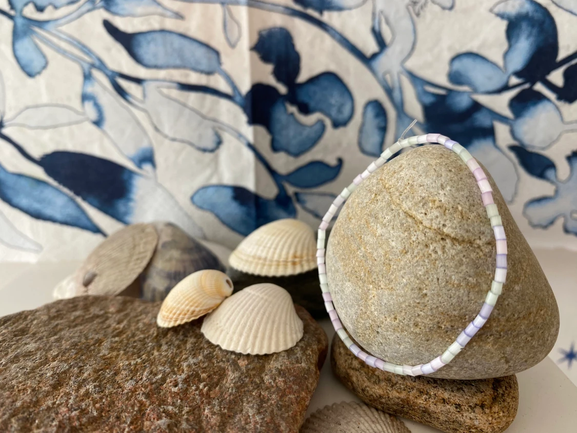 Armbandet är gjord med kärlek och tålamod. Armbandet är slittålig och kan badas och duschas med. Armbandet är gjord på ett elastiskt tråd med lila och gröna pärlor.