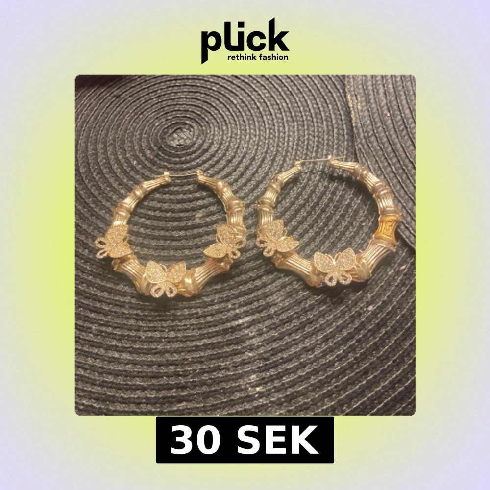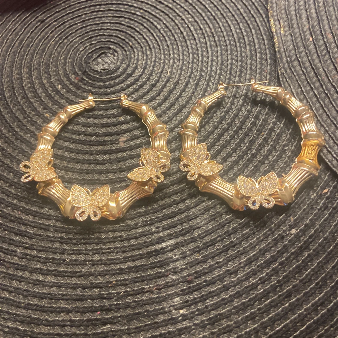 Säljer ett par stora, runda hoop-örhängen i guld med glittriga fjärilsdetaljer.