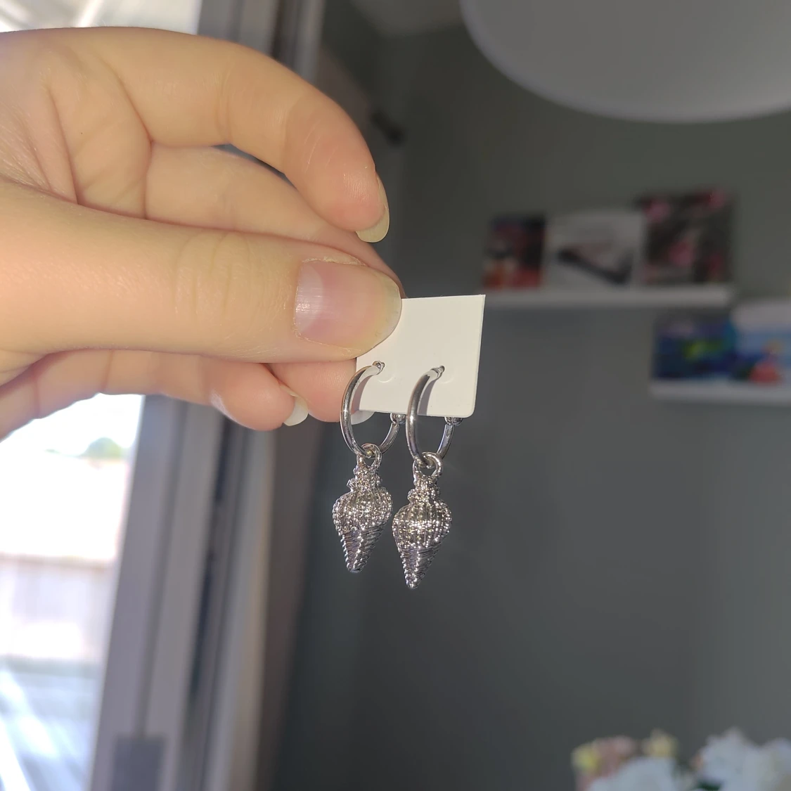 Snygga silvriga örhängen med hängande snäckformade berlocker. Örhängena har en rund, klassisk ringdesign och snäckorna är detaljerade och glittrar lätt i ljuset. Perfekt för dig som gillar strandvibbar och coola accessoarer.