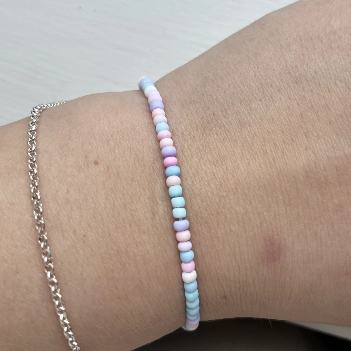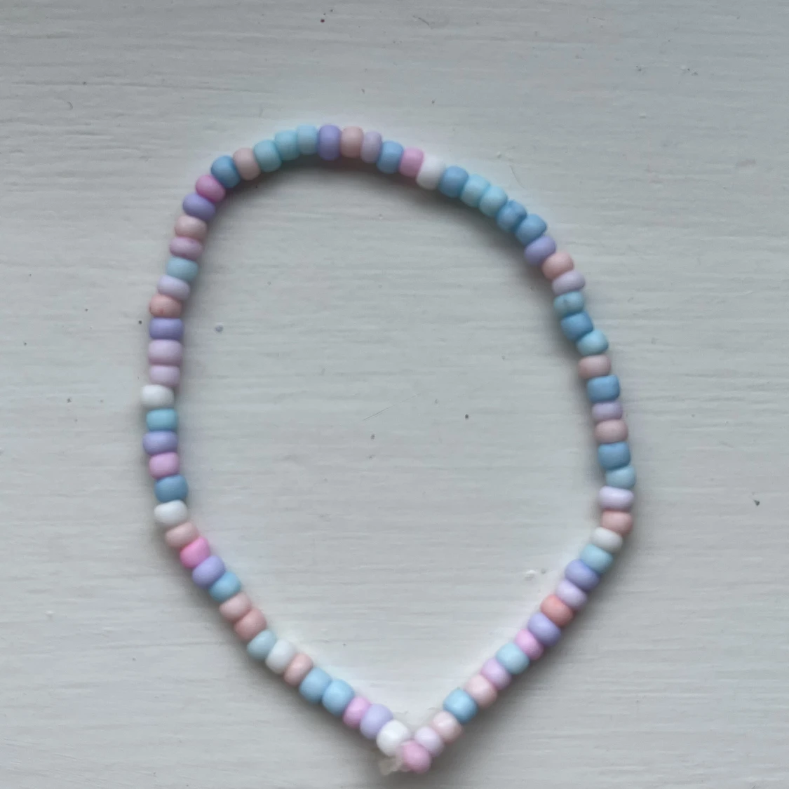 Olika rosa, lila, blå och vita Pastell pärlor i random ordning Storlekar & pris (inklusive frakt) XS, 13-14,9 cm (21kr) S, 15-16,9 cm (21kr) M, 17-18,9 cm (22kr) L, 19-21,9 cm (23kr)