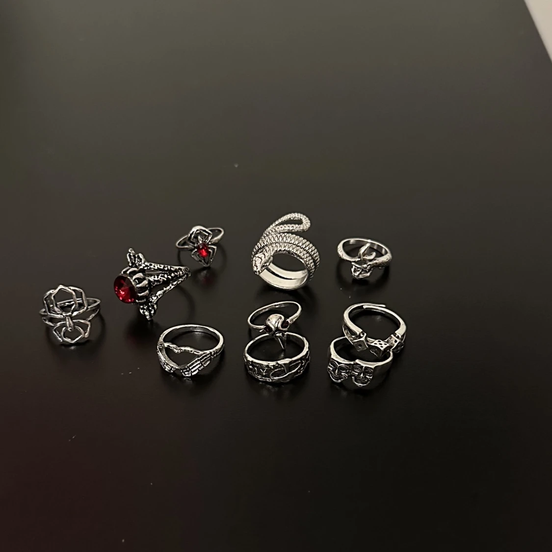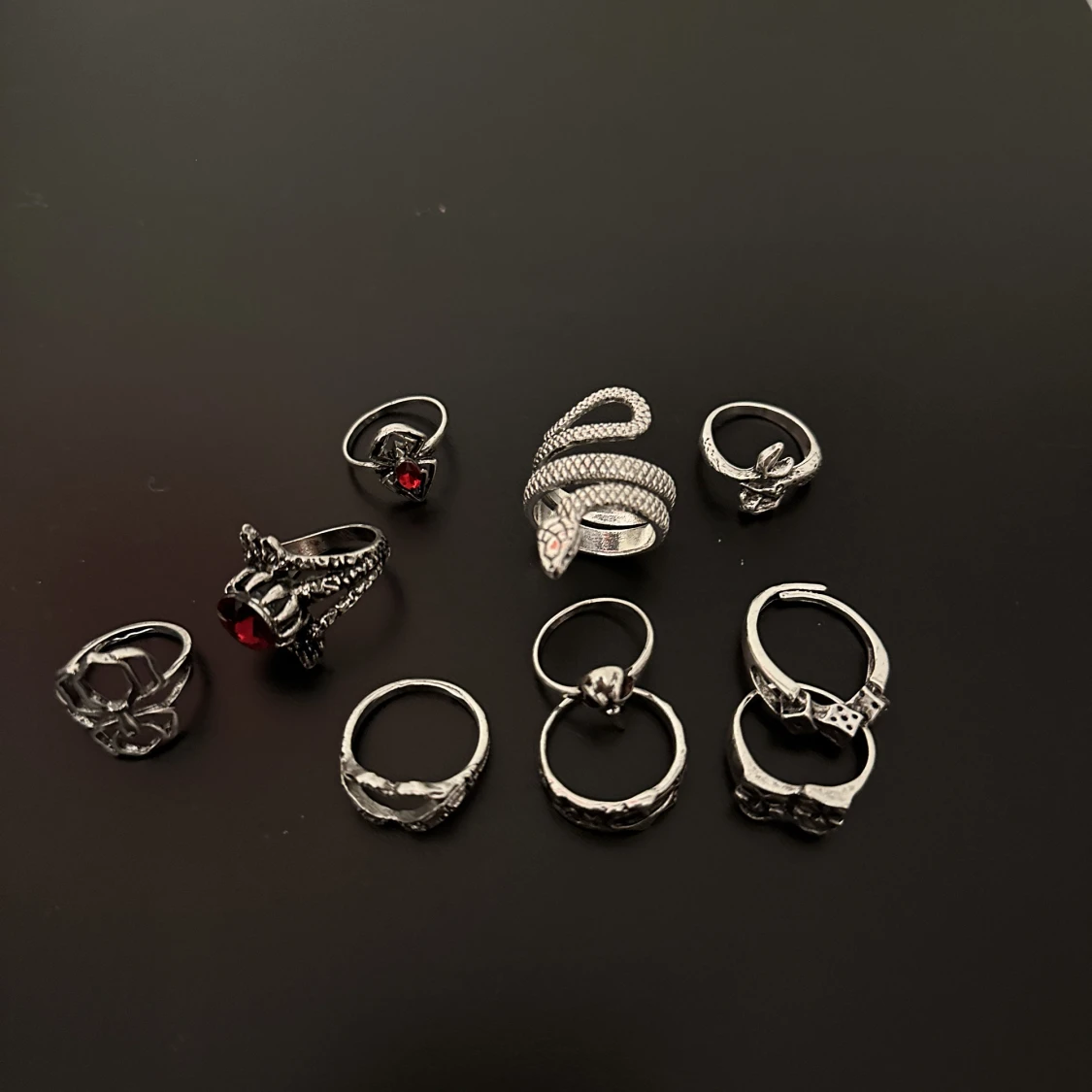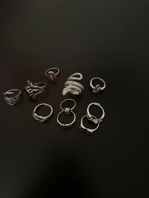 10x metallringar i legerat stål. Snake, spider, dödskalle o sån stil. Riktigt clean. Storlekar ca 7-9 man kan böja vissa försiktigt
