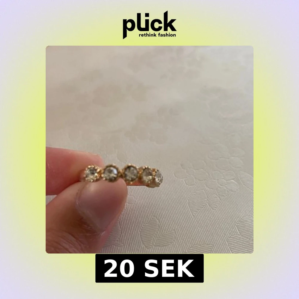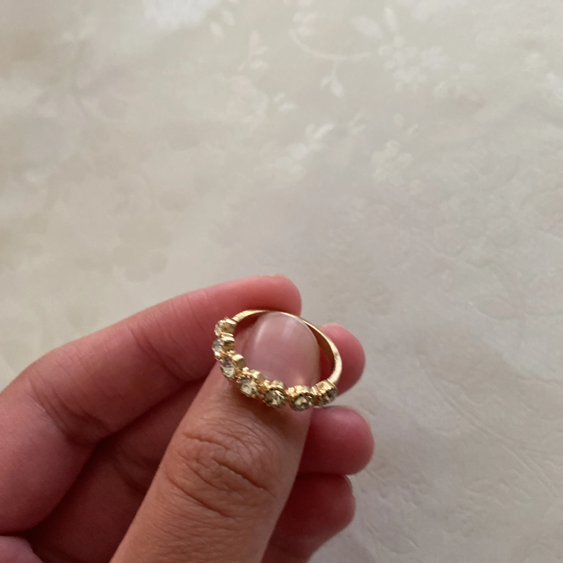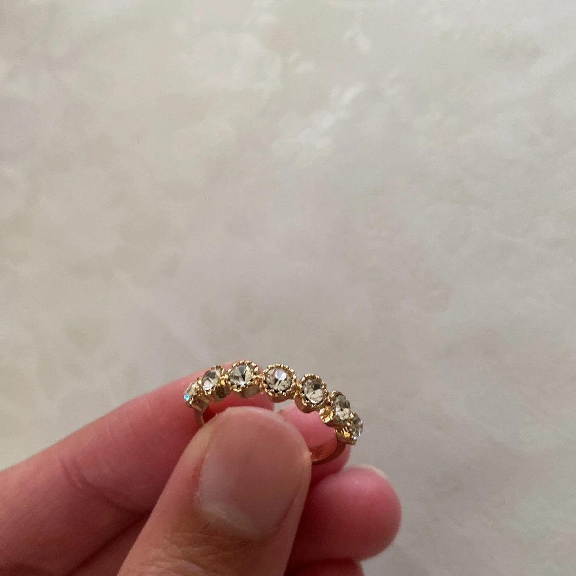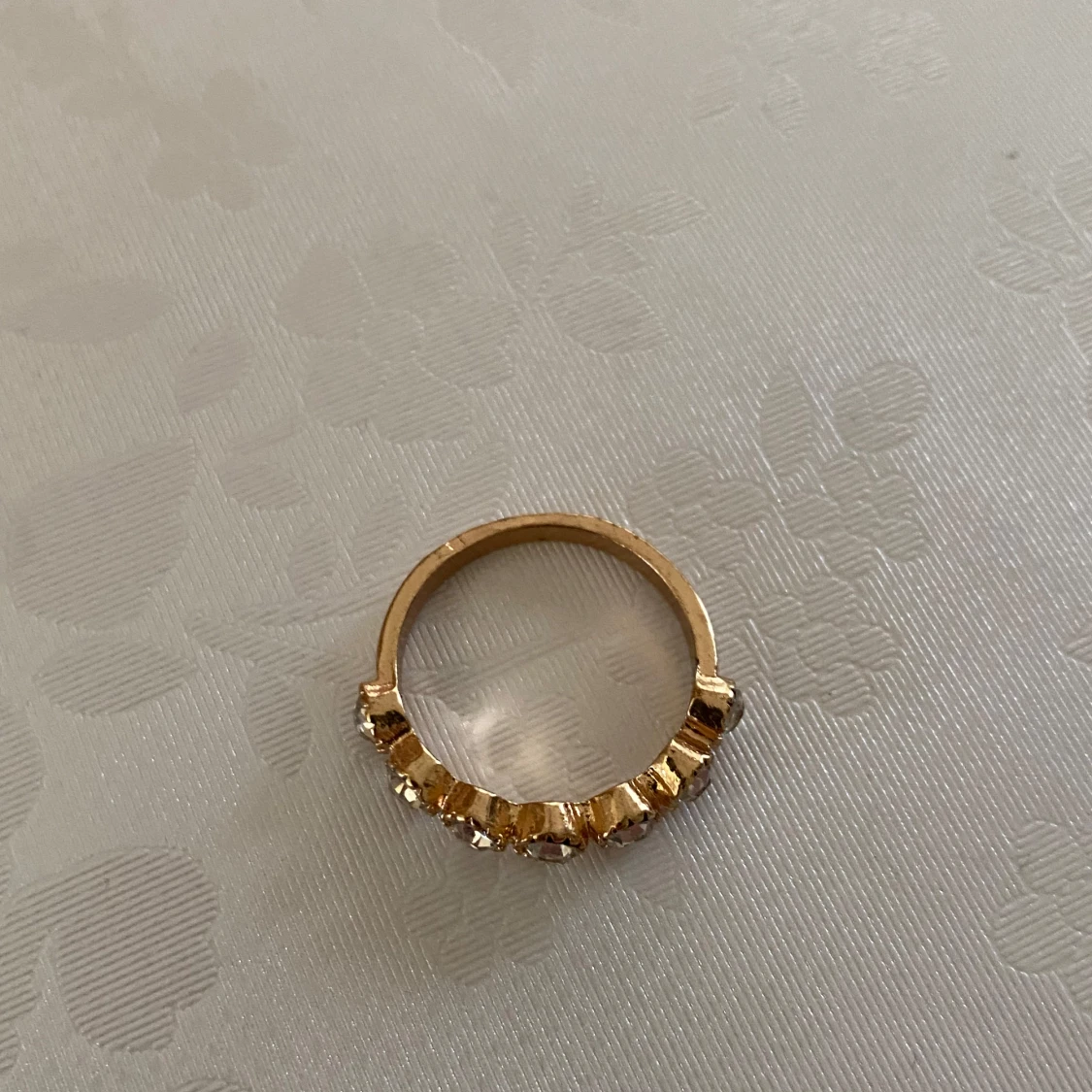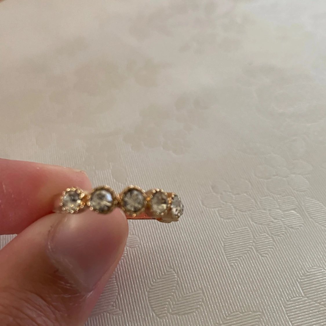 Säljer en guldfärgad ring med sex klara stenar i rad. Ringen har en klassisk och elegant design. Aldrig använd, säljer eftersom den är för liten för mig, pris kan diskuteras ❤️❤️