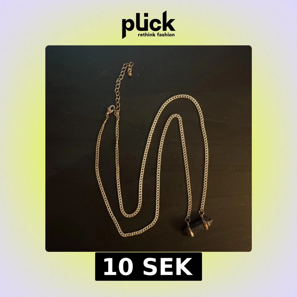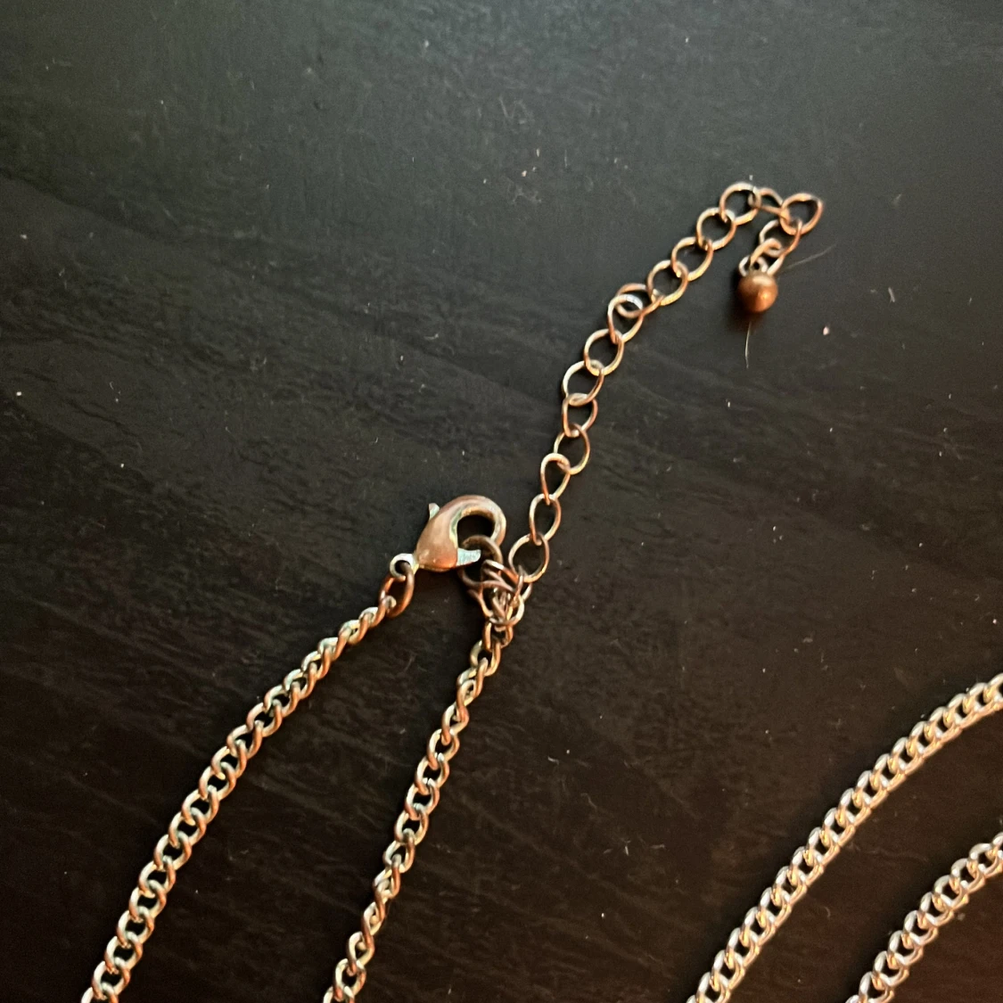 Snyggt halsband med en kedja i silverfärg och ett blått kristallhänge. Kedjan har en justerbar längd med karbinhake. Det silvriga hsr slitits bort lite med användning men syns bara på nära håll