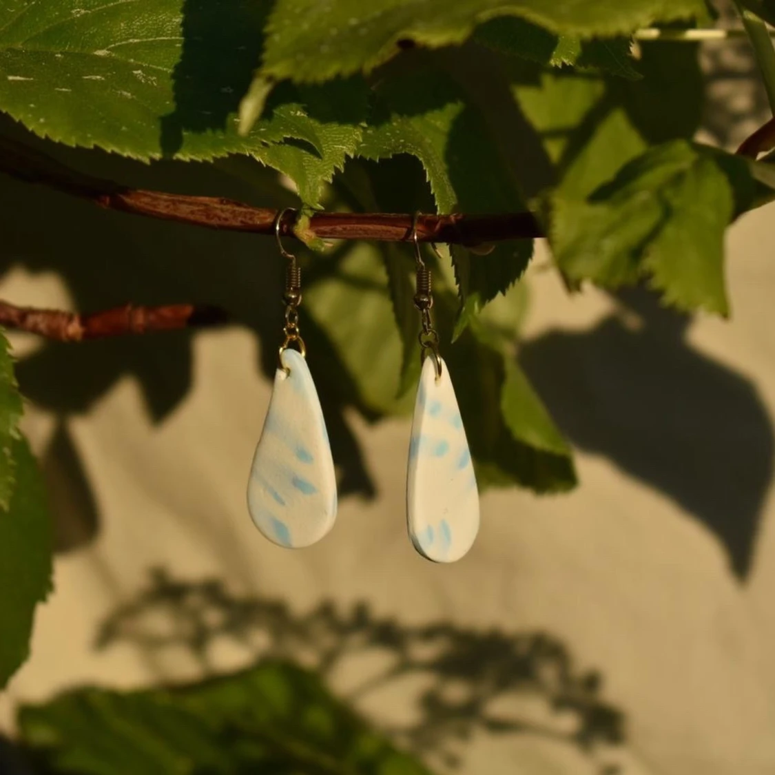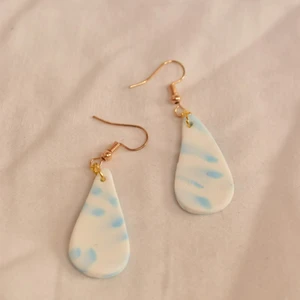 Vit bakgrund med blått mönster. Handgjorda örhängen utav polymer lera med guldhänge, ca 3-4 cm i diamanter. 49kr + 20kr frakt