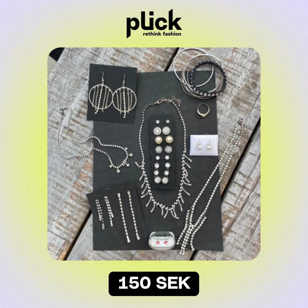 Säljer en fantastisk samling av glittriga smycken som inkluderar örhängen, halsband, armband och ringar. Det finns stora, runda örhängen med hängande detaljer, flera par gnistrande örhängen med pärlor och stenar, samt ett halsband med ett vackert, glittrigt mönster. Armbanden är i olika stilar, både tunna och breda, och det finns även en enkel ring. Perfekt för fest och speciella tillfällen!