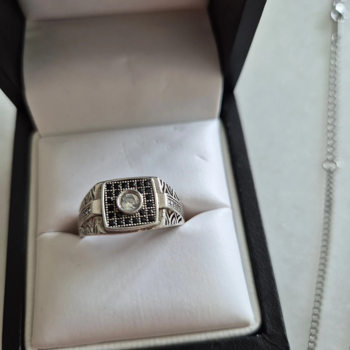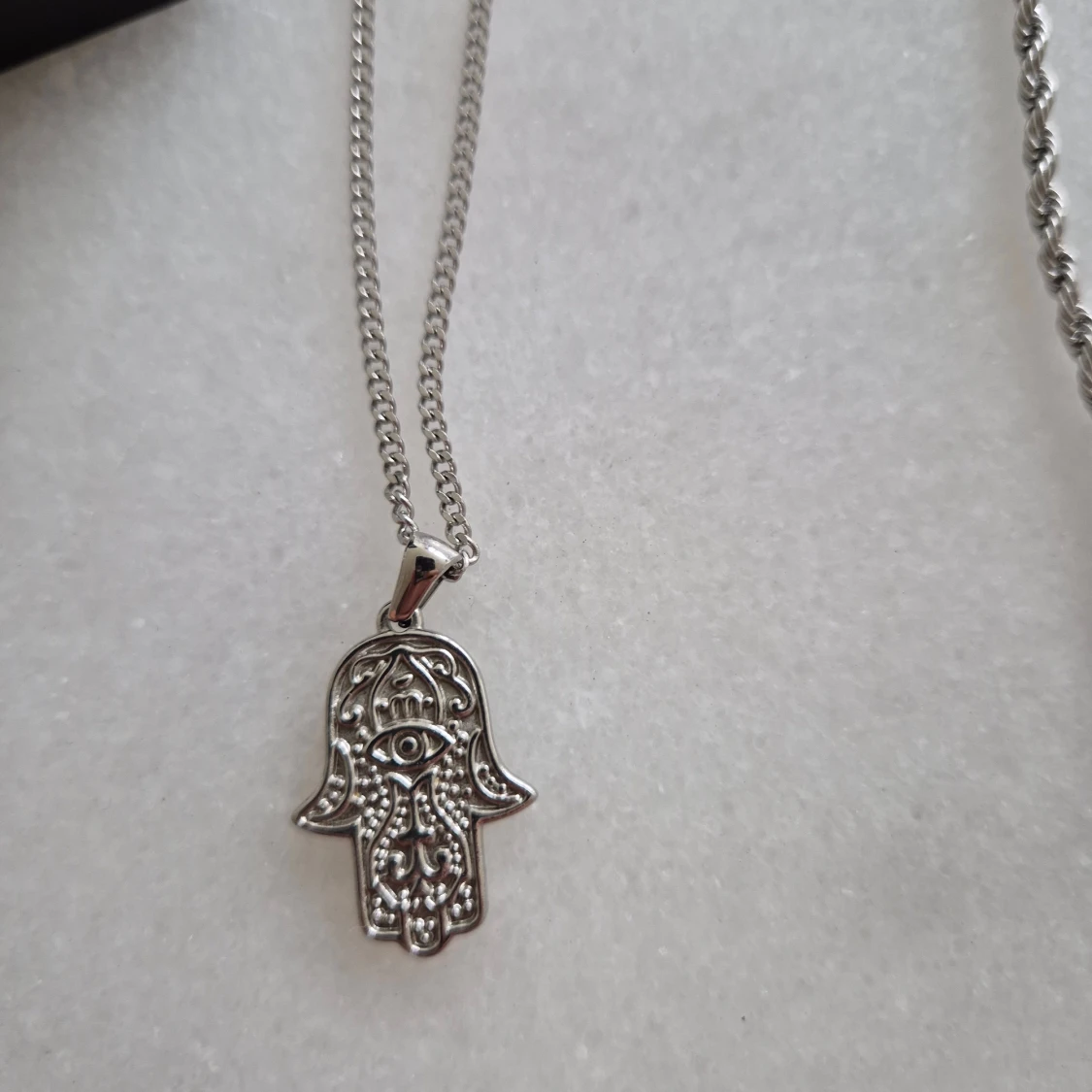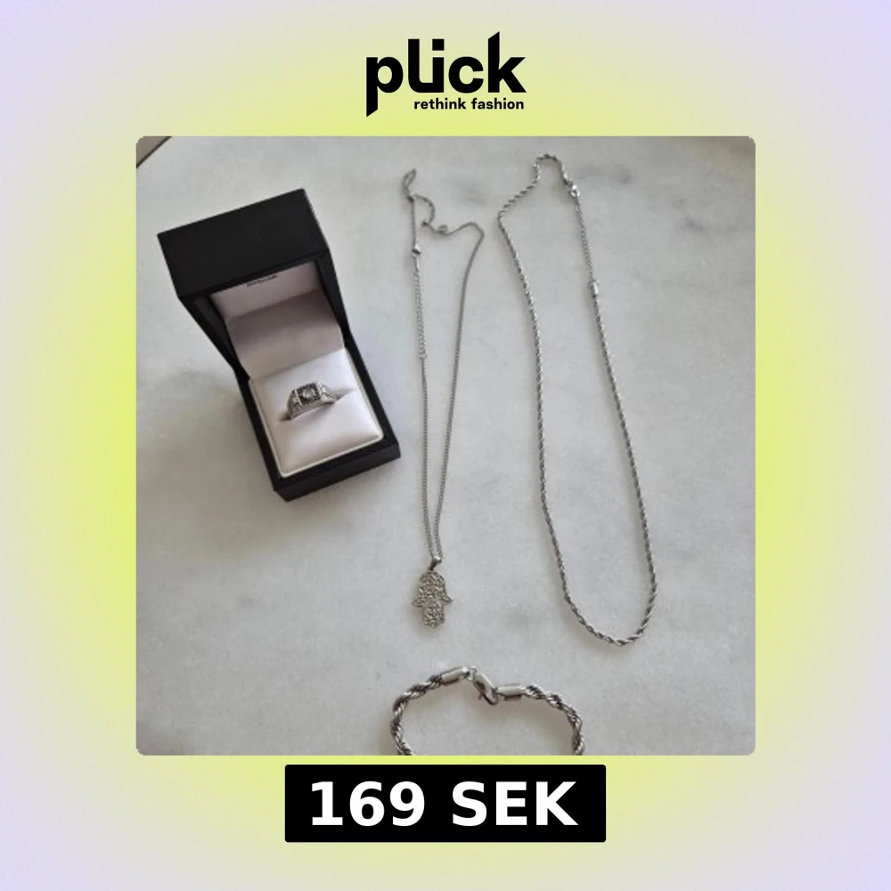 Säljer ett snyggt smyckeset i silverfärg som innehåller en ring med svart och vit detalj samt två halsband, varav ett med hamsa-hand hänge och ett tvinnat kedjehalsband. Dessutom ingår ett matchande armband i tvinnad design. Perfekt för dig som gillar stilrena accessoarer. Rostfrittstål går att duscha med och tål svett.