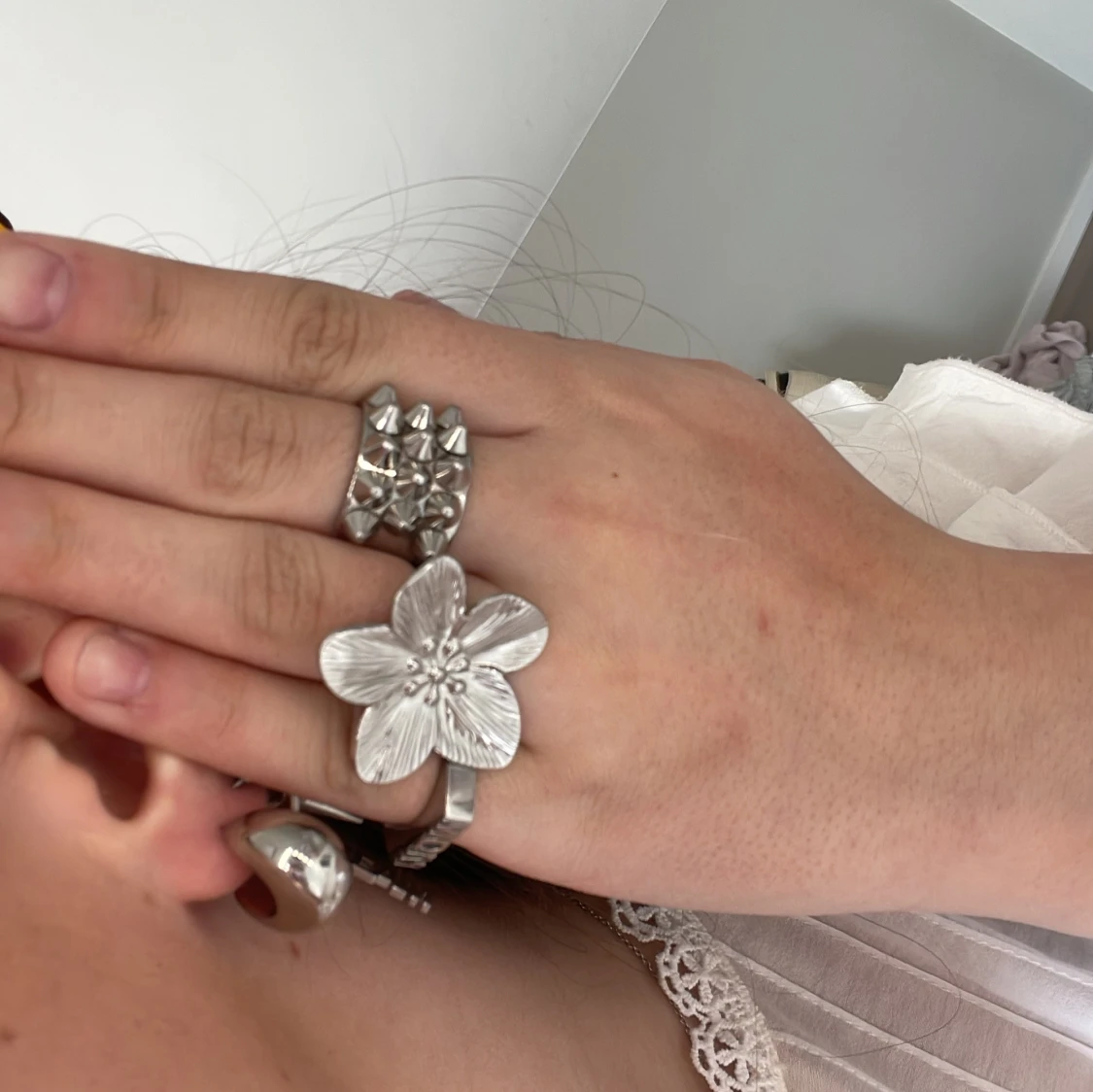 Snyggt smyckeset med ringar och örhängen i silverfärg. Ringarna har en unik design med en blomma och nitar. Örhängena är formade som månar och ett med texten 'DREAM'. Perfekt för att ge en edgy touch till din stil.