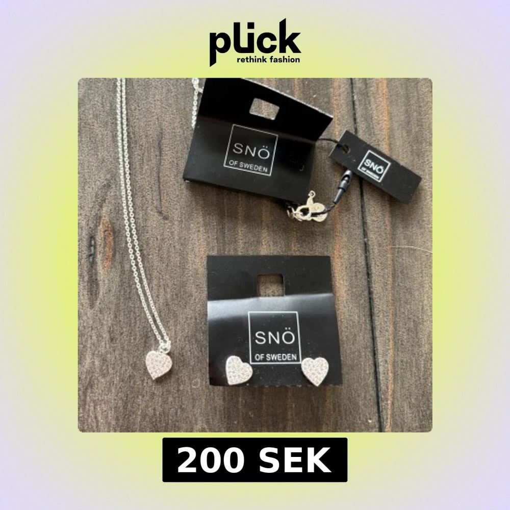 Säljer ett set med halsband och örhängen från SNÖ of Sweden. Båda smyckena har hjärtformade hängen med glittriga detaljer. Perfekt för att lägga till lite extra bling till din outfit.
